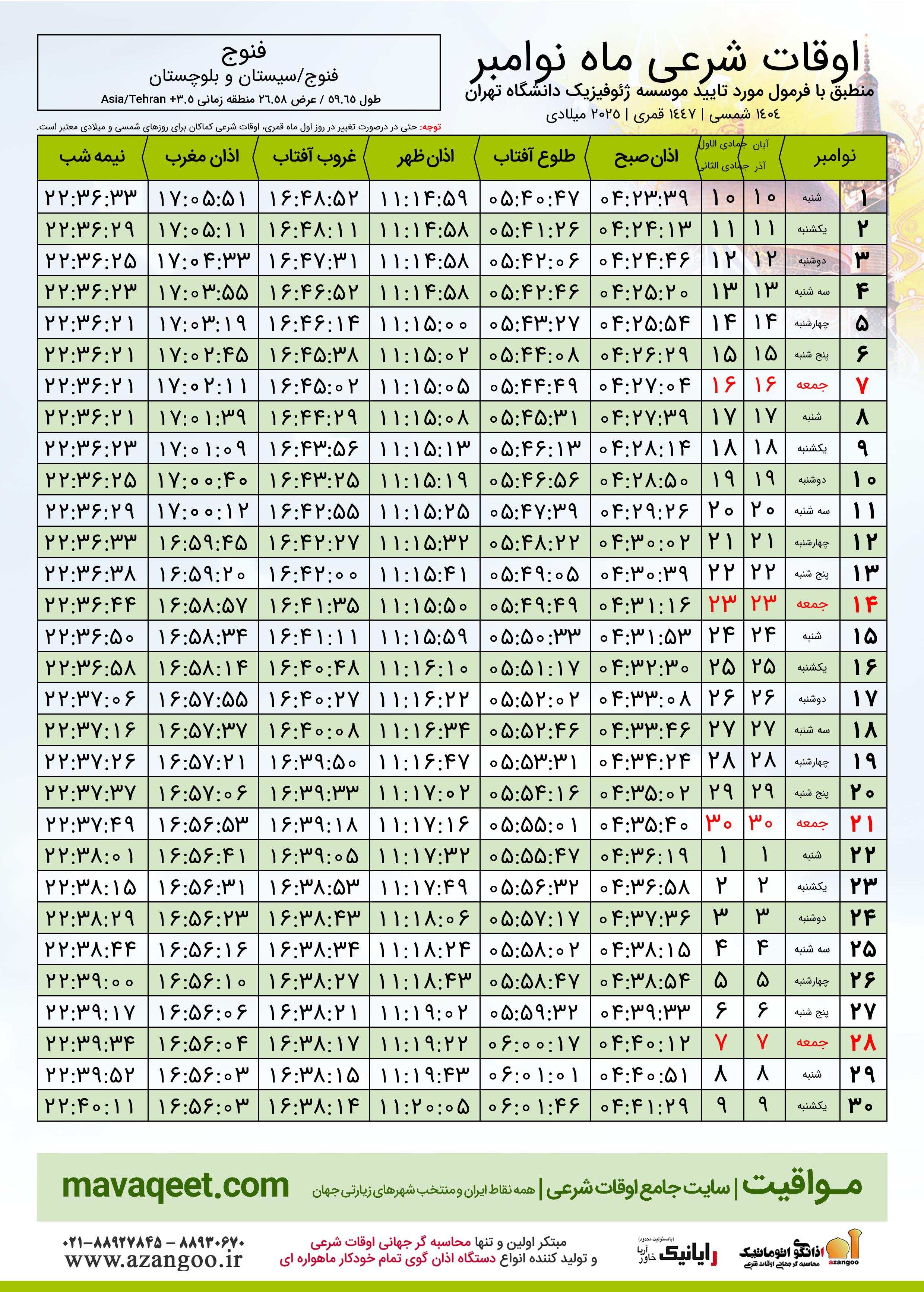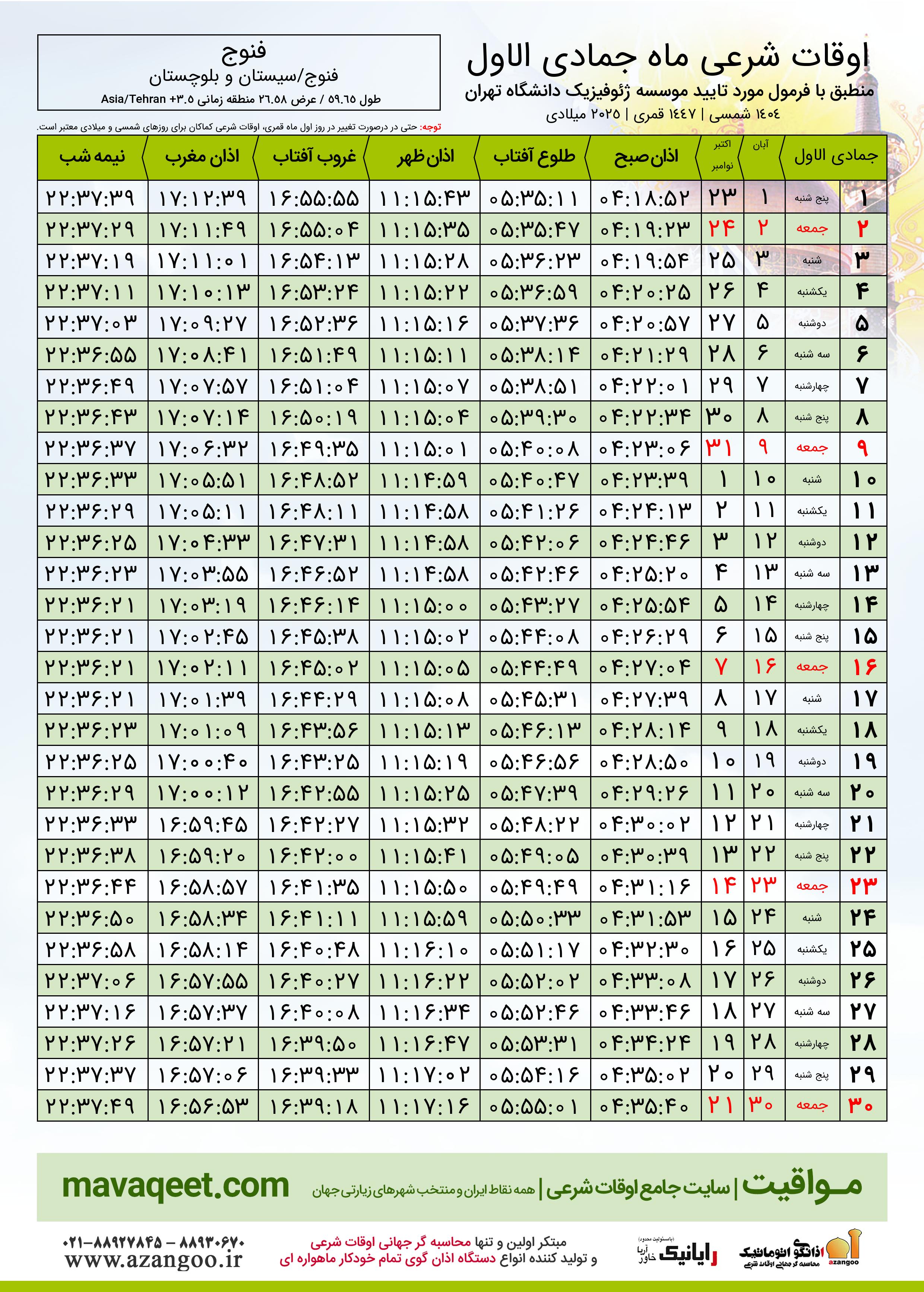 اوقات شرعی ماه رمضان شهر فنوج ١٤٠٤ - ٠٤ شمسی | ٢٠٢٦ میلادی