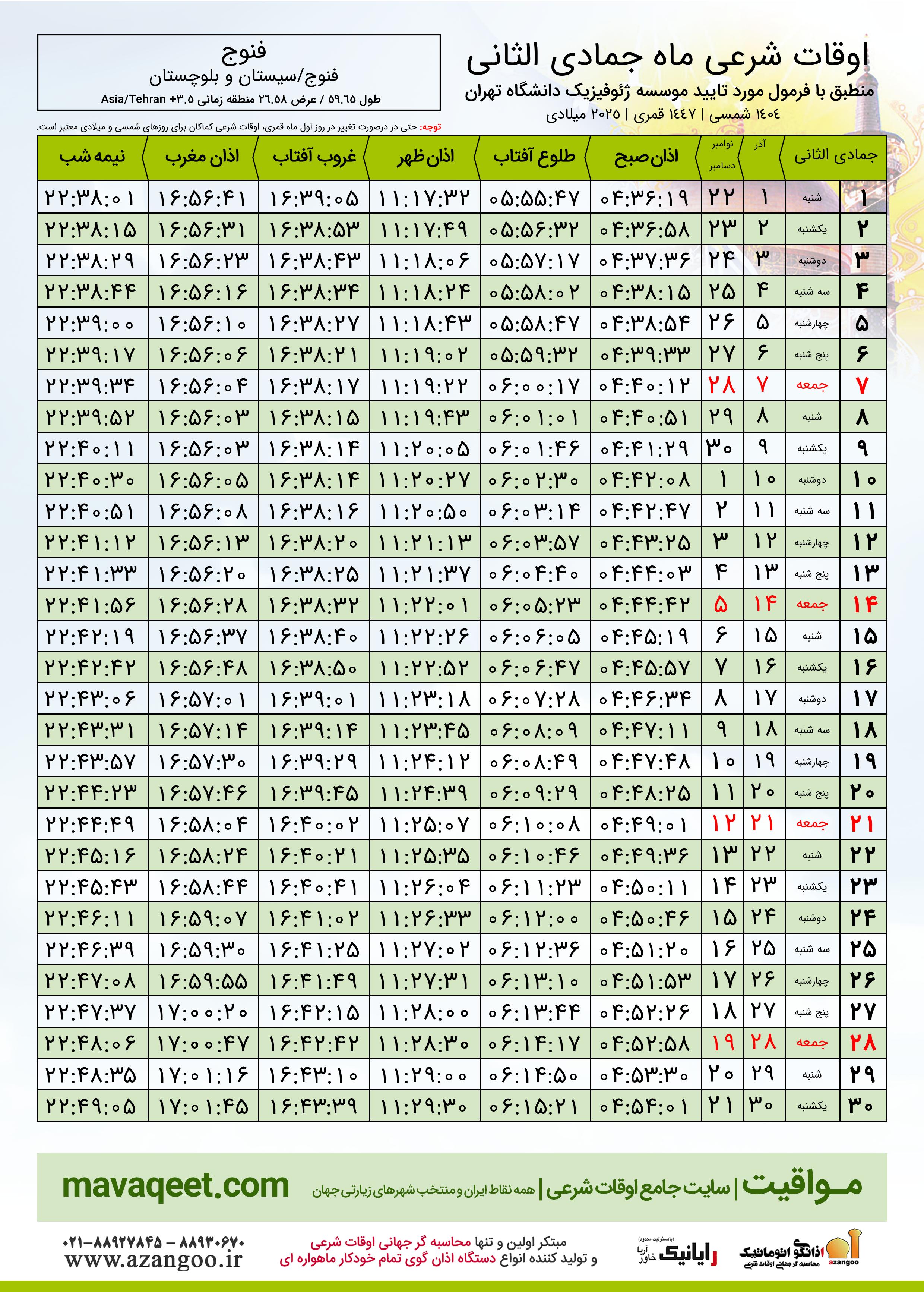 اوقات شرعی ماه جمادی الثانی ١٤٤٧ هـ.ق شهر فنوج بر