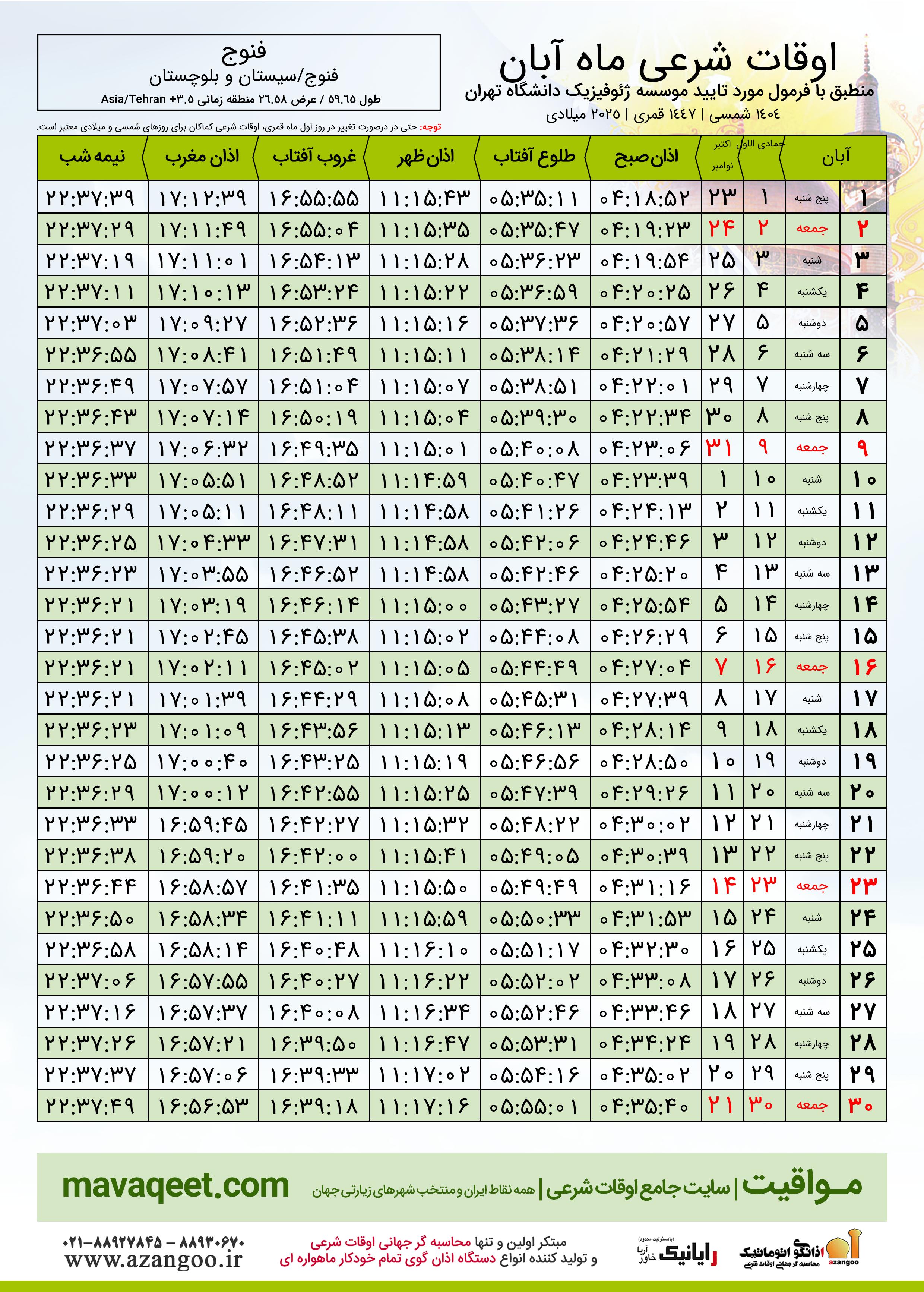 اوقات شرعی آبان ١٤٠٤ شمسی شهر فنوج