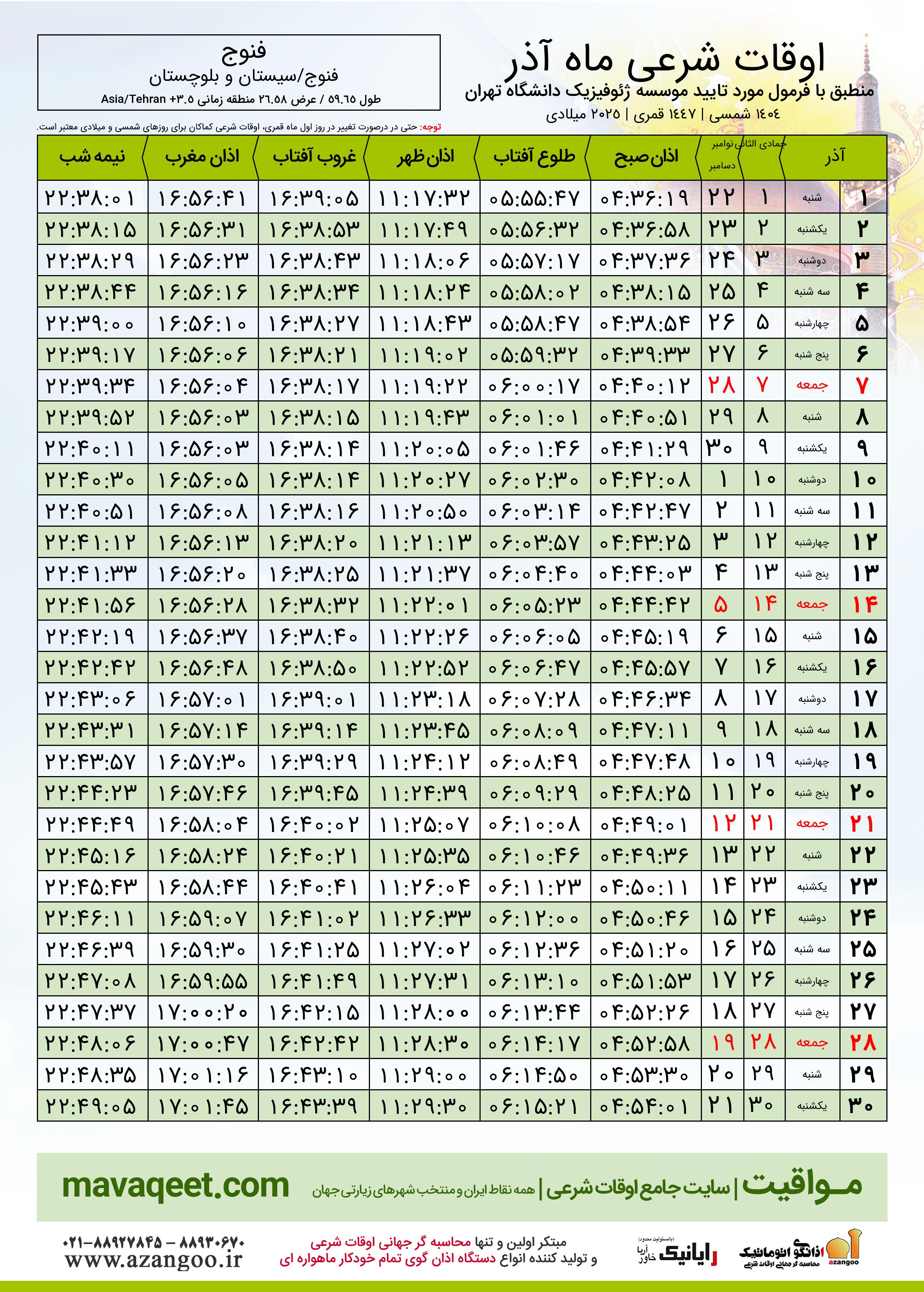 جدول اوقات شرعی آذر ١٤٠٤ شمسی شهر فنوج