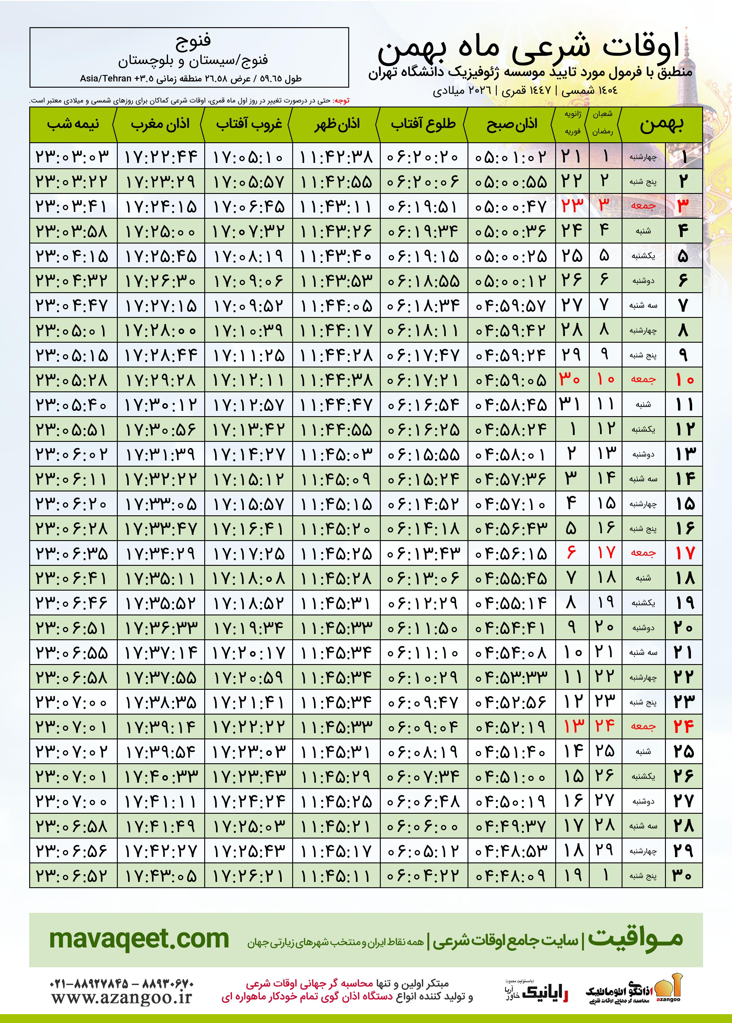 دانلود اوقات شرعی بهمن ٠٤ - ١٤٠٤ شهر فنوج
