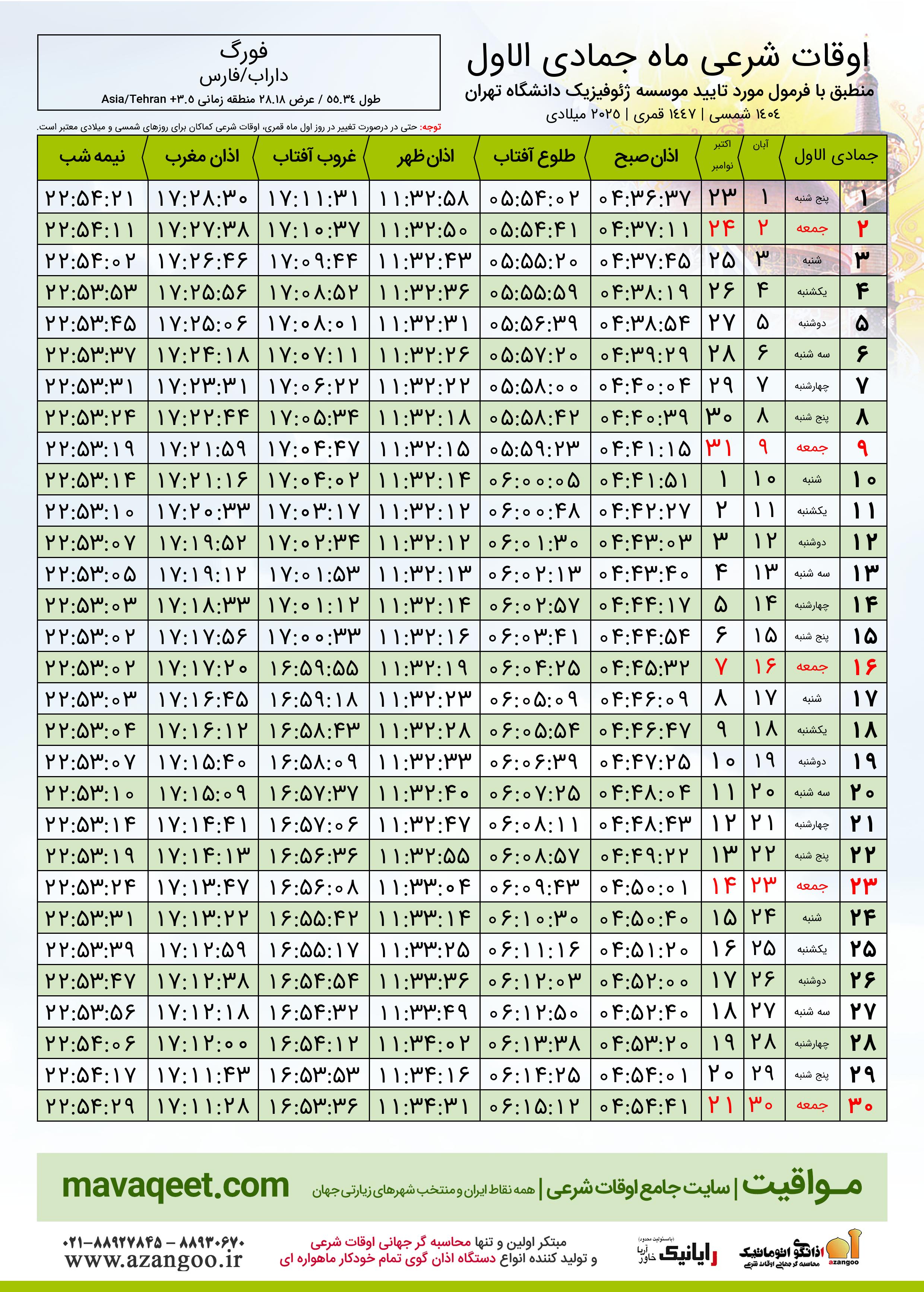 اوقات شرعی ماه جمادی الاول ١٤٤٧ هـ.ق شهر فورگ بر