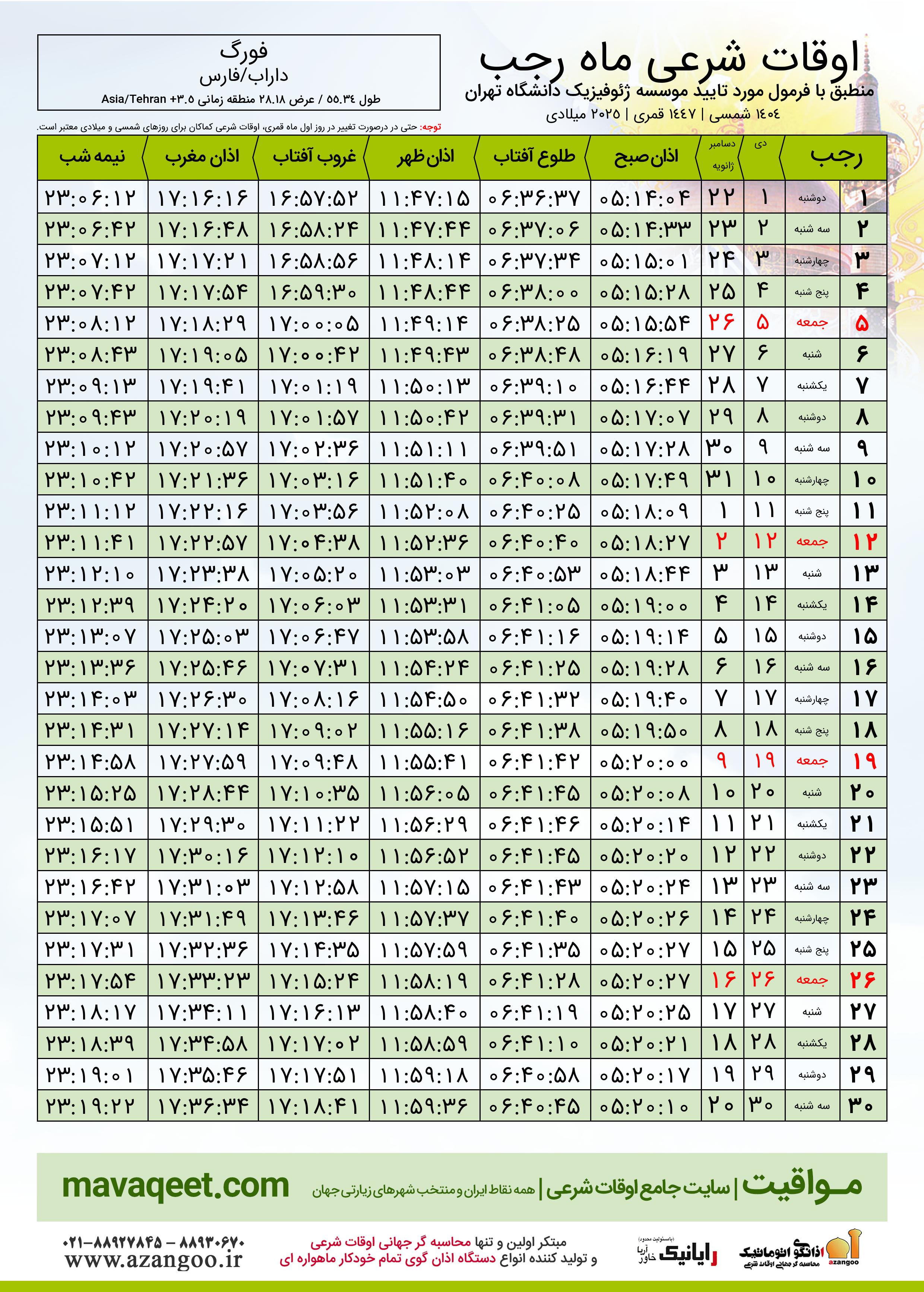 اوقات شرعی ماه رجب ١٤٤٧ هـ.ق شهر فورگ بر