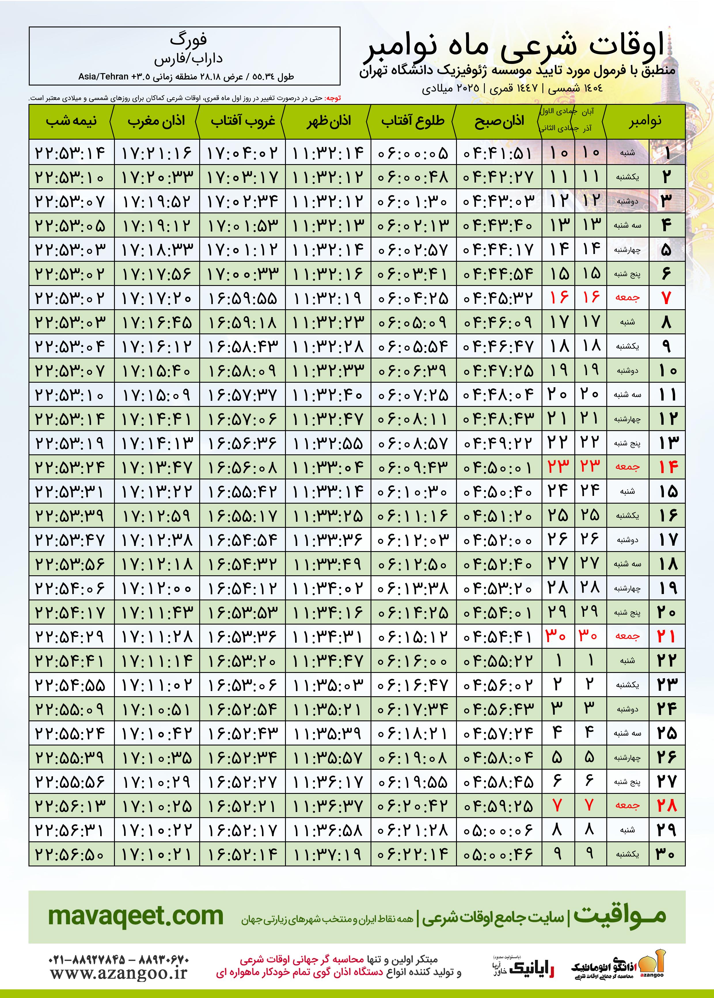 جهت نمایش تصویر جدول اوقات شرعی جدول اوقات شرعی نوامبر ٢٠٢٥ میلادی شهر فورگ شهر فورگ در اندازه