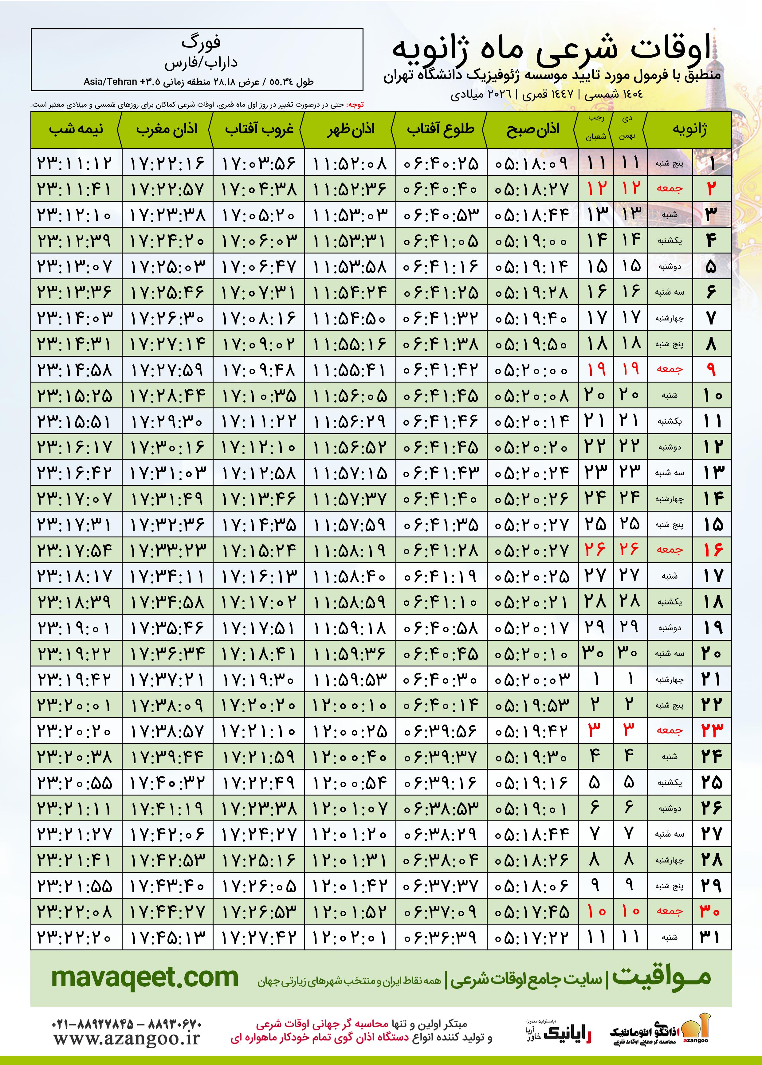 دانلود اوقات شرعی ماه رمضان ٠٤ - ١٤٠٤ شمسی | ٢٠٢٦ میلادی | ١٤٤٧ قمری شهر فورگ