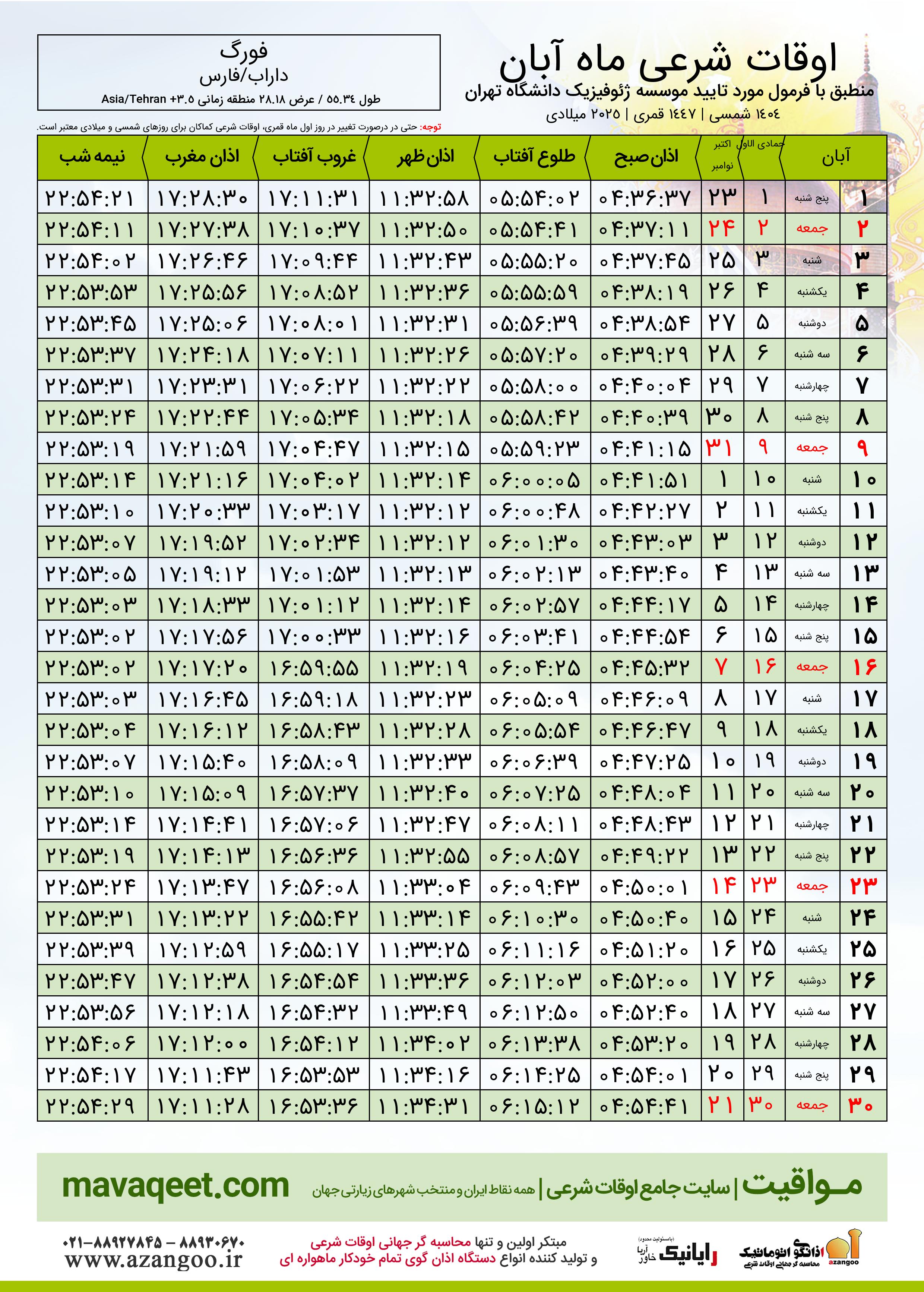 جدول اوقات شرعی آبان ١٤٠٤ شمسی شهر فورگ