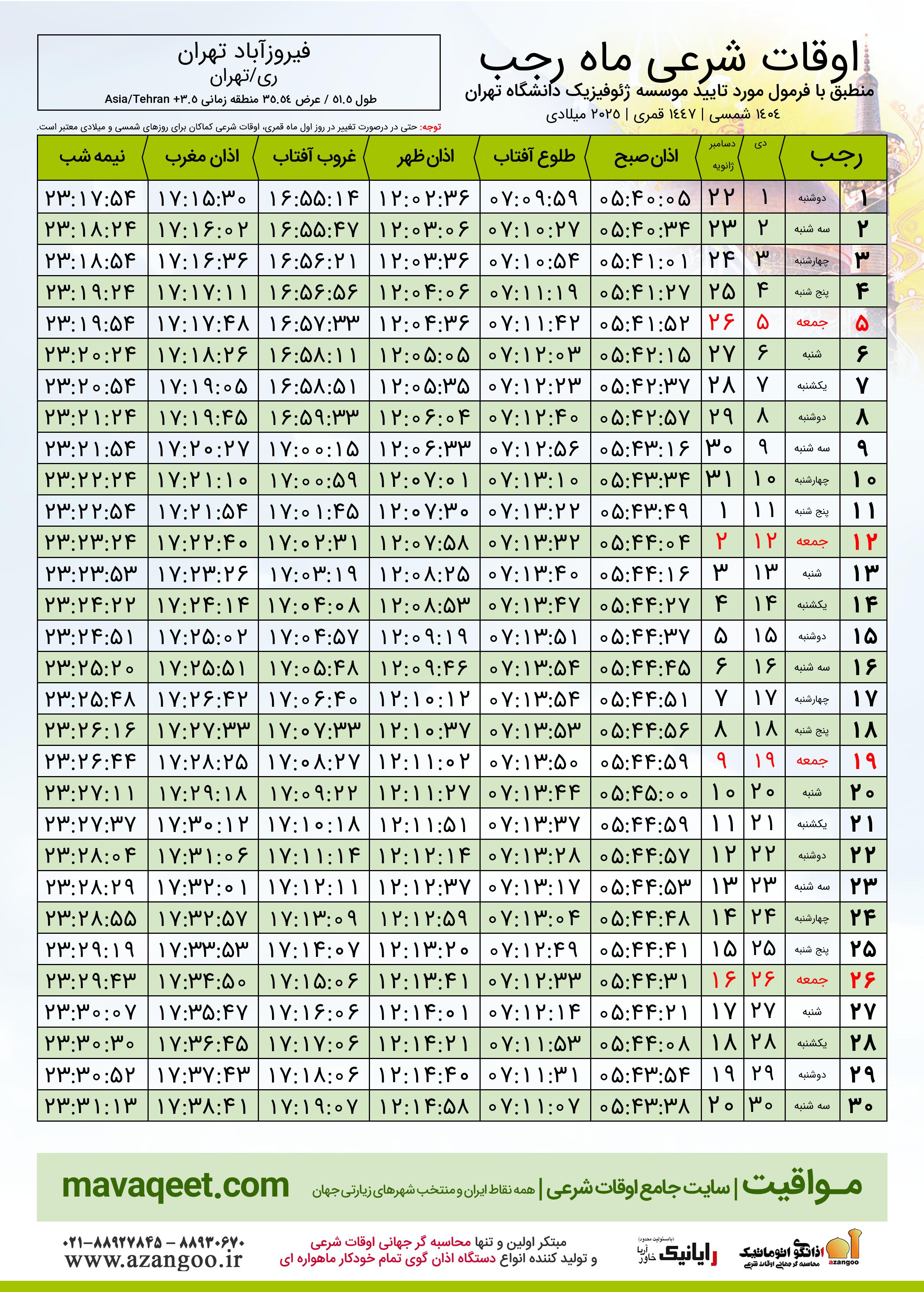 اوقات شرعی ماه رجب ١٤٤٧ هـ.ق شهر فیروزآباد تهران بر