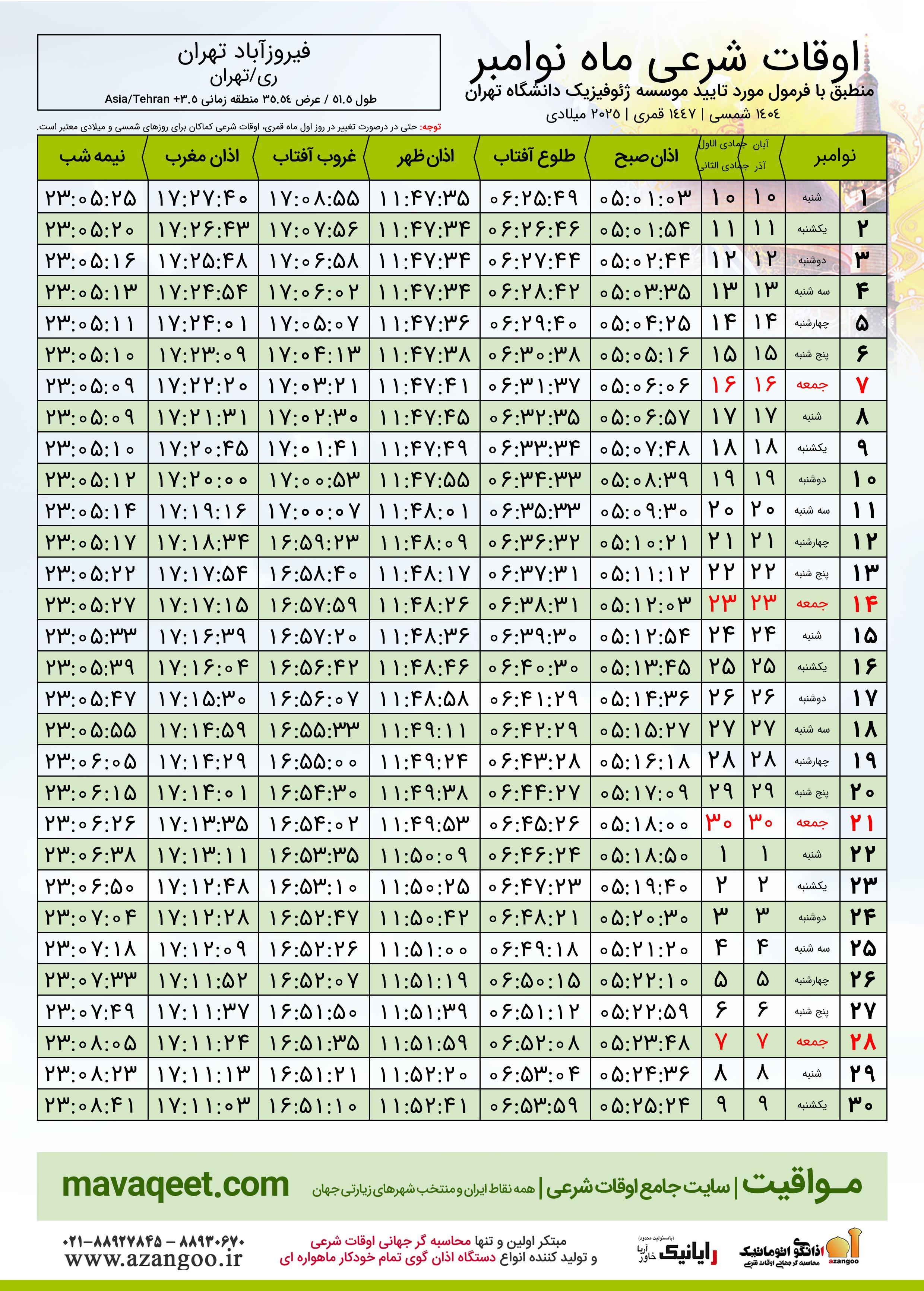 اوقات شرعی نوامبر ٢٠٢٥ میلادی شهر فیروزآباد تهران