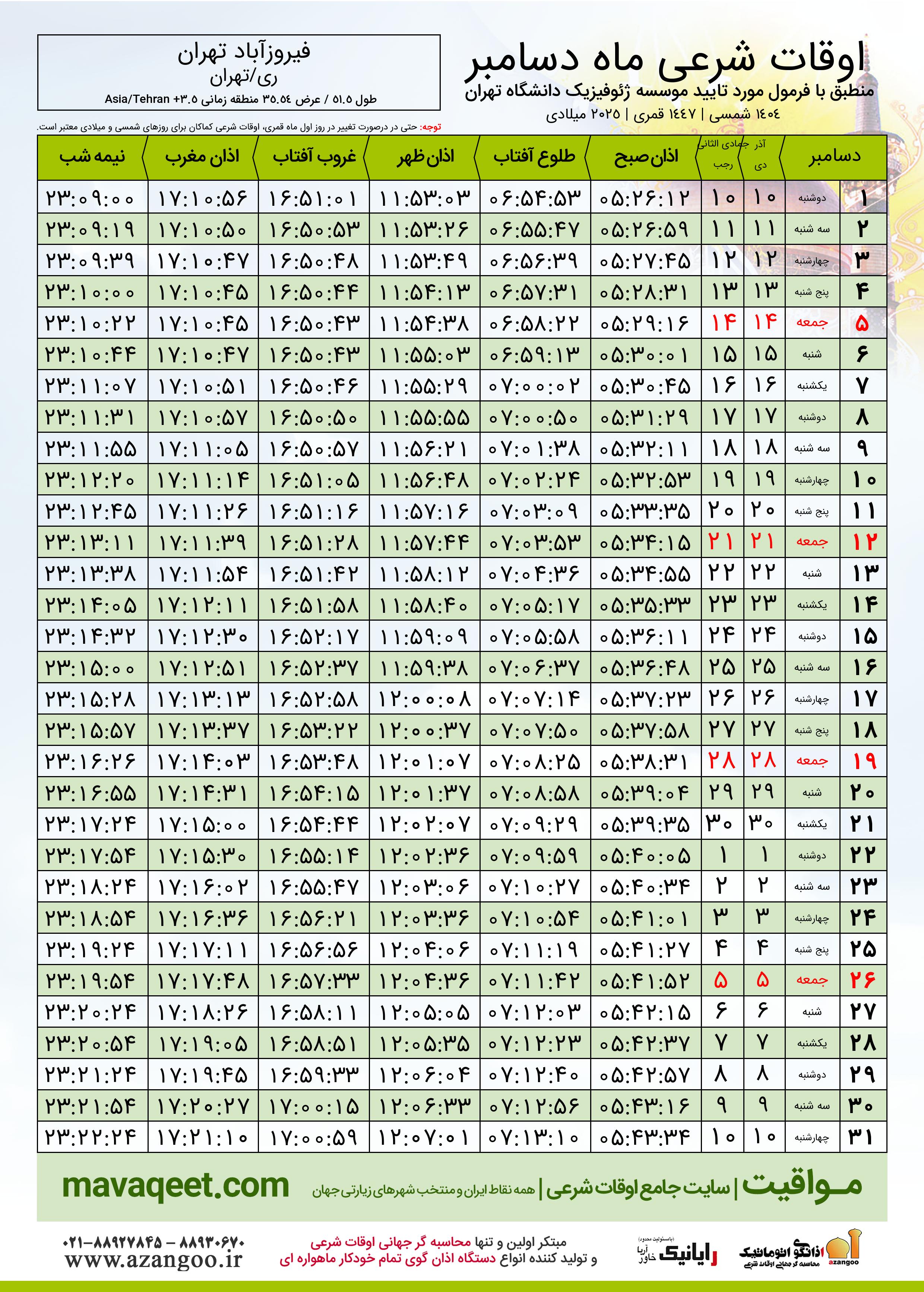 جدول اوقات شرعی دسامبر ٢٠٢٥ میلادی شهر فیروزآباد تهران