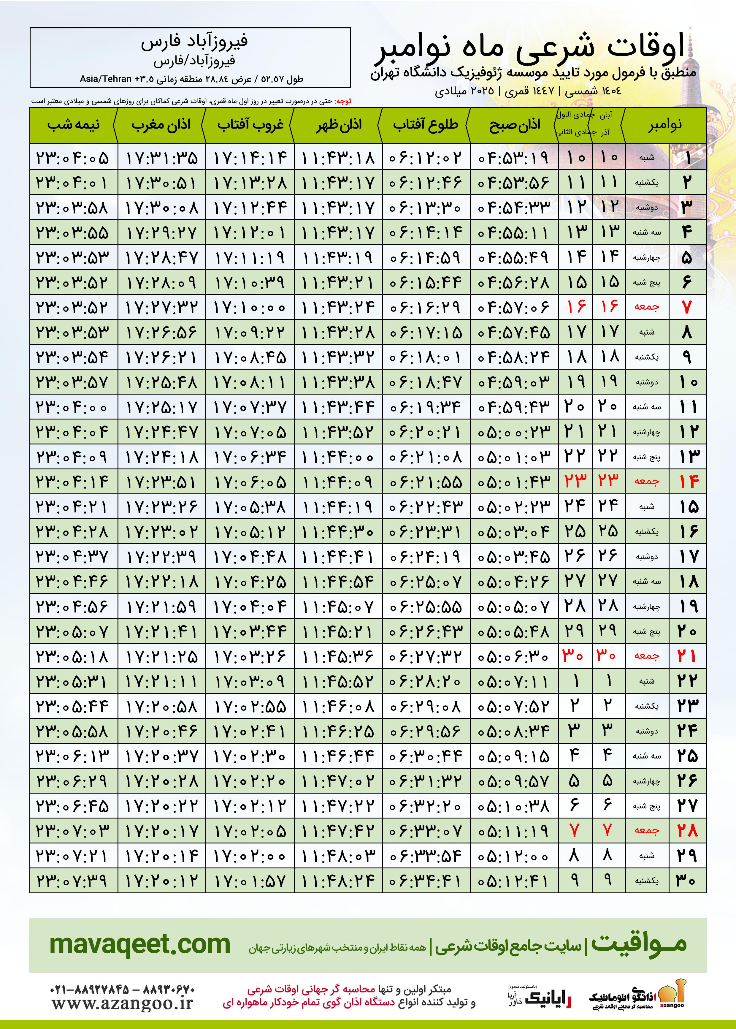 اوقات شرعی نوامبر ٢٠٢٥ میلادی شهر فیروزآباد فارس