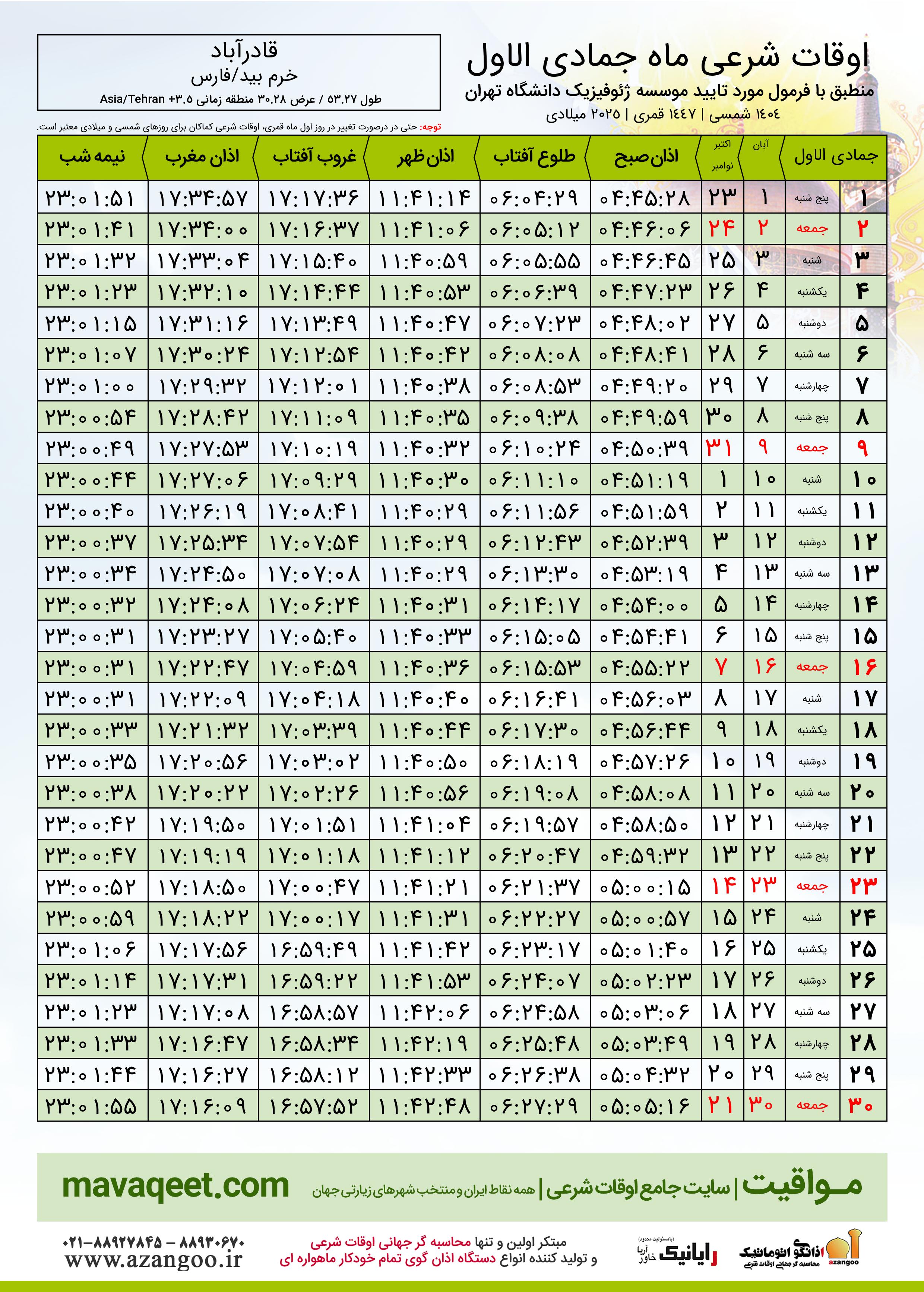 جدول اوقات شرعی جمادی الاول ١٤٤٧ قمری شهر قادرآباد