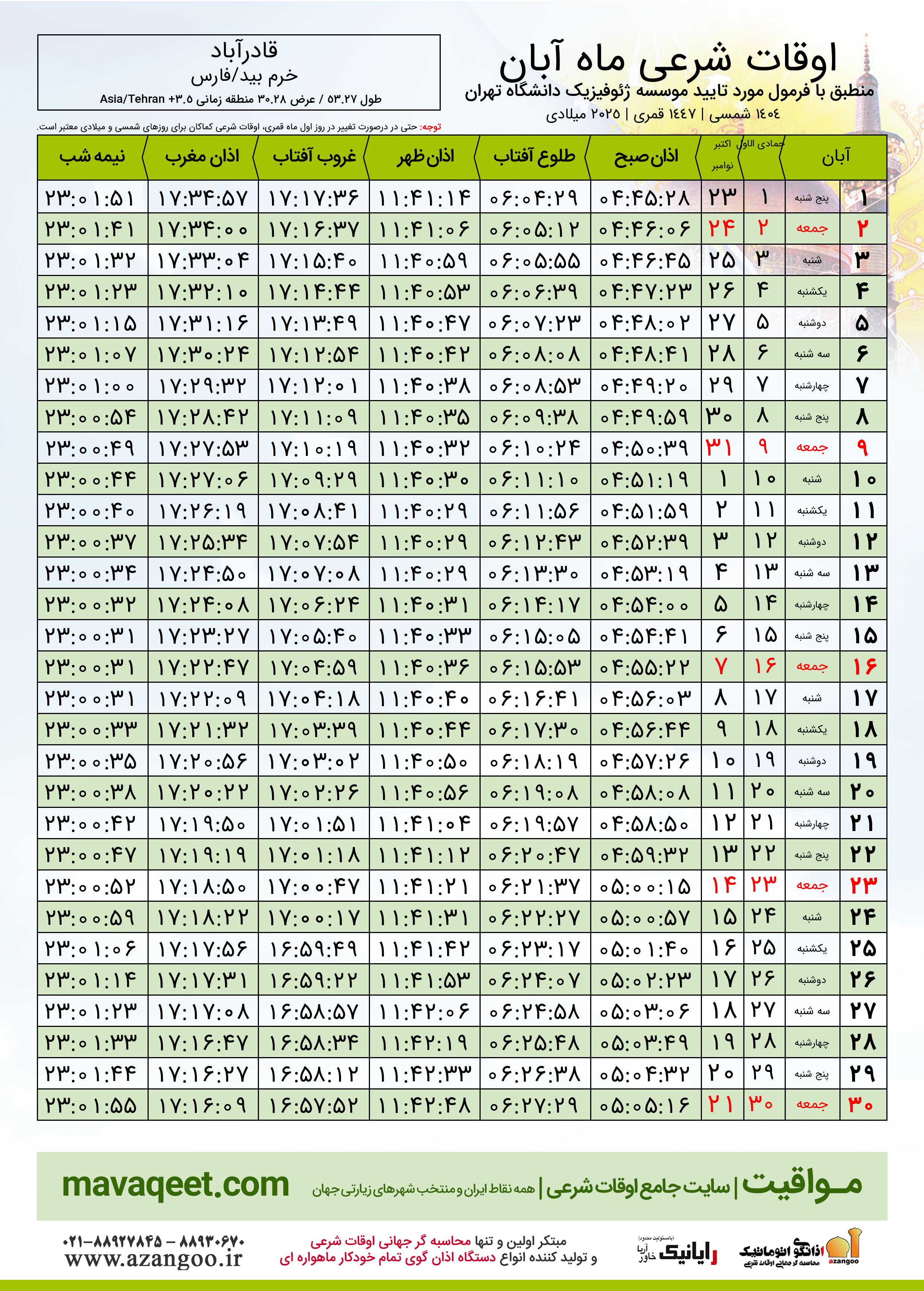 اوقات شرعی آبان ١٤٠٤ شمسی شهر قادرآباد