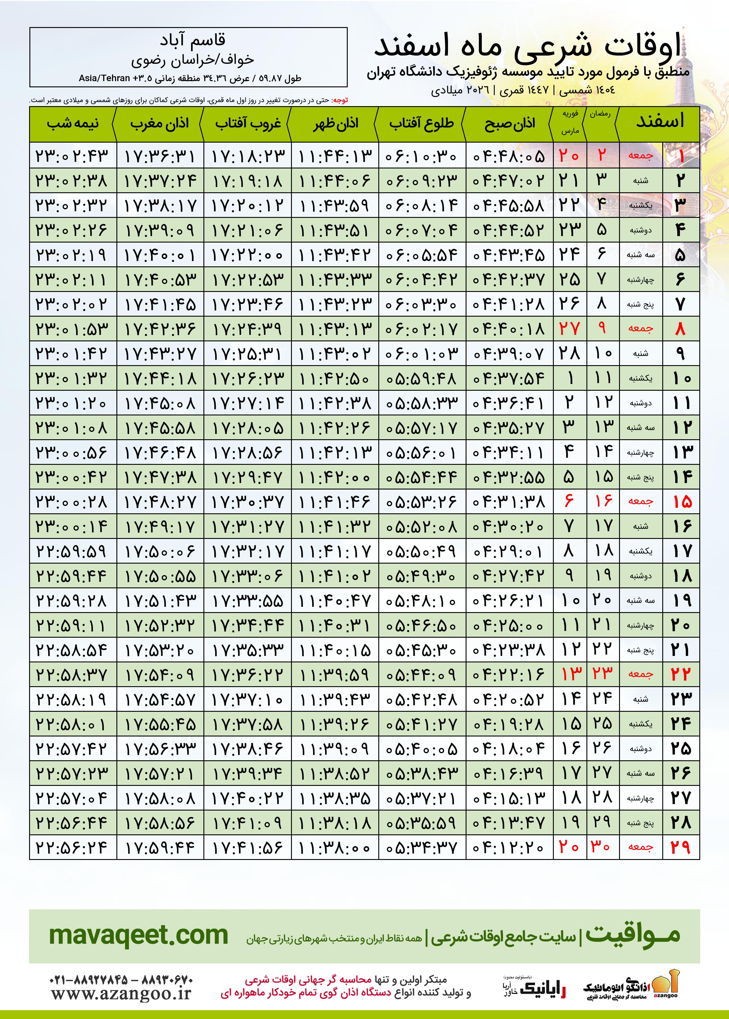 دانلود اوقات شرعی ماه رمضان ٠٤ - ١٤٠٤ شمسی | ٢٠٢٦ میلادی | ١٤٤٧ قمری شهر قاسم آباد