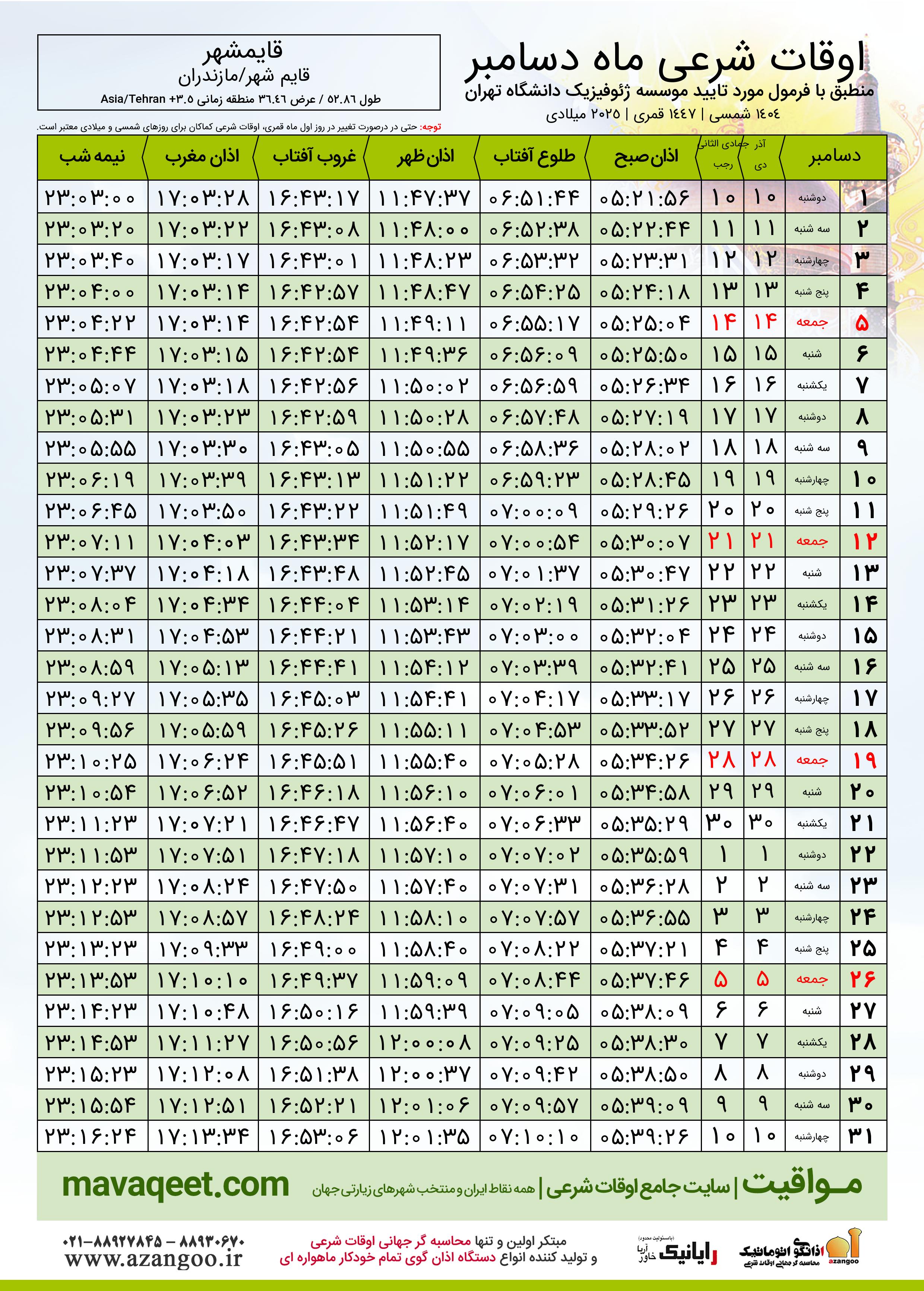 جدول اوقات شرعی دسامبر ٢٠٢٥ میلادی شهر قایمشهر