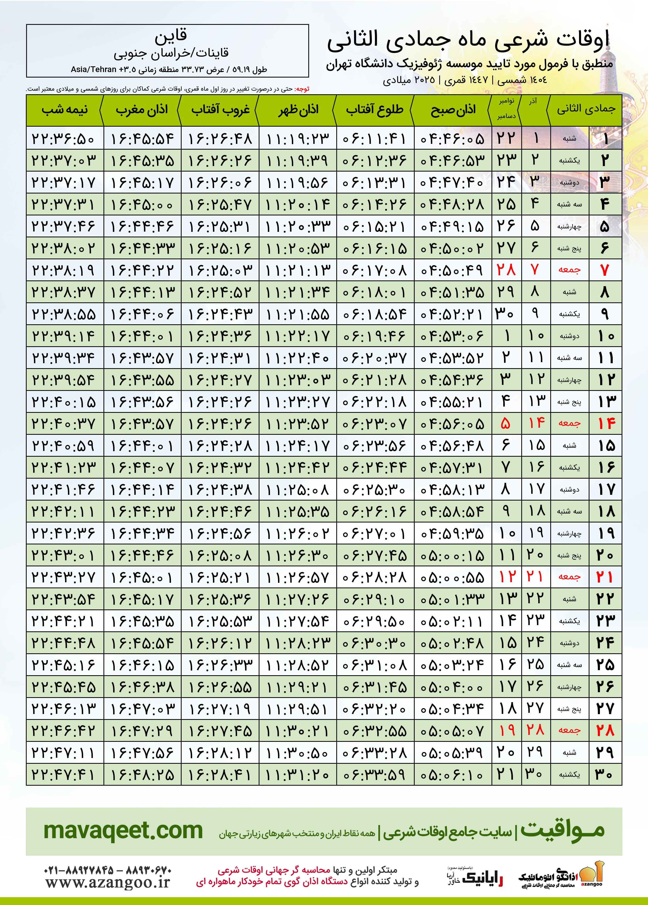 اوقات شرعی ماه جمادی الثانی ١٤٤٧ هـ.ق شهر قاین بر