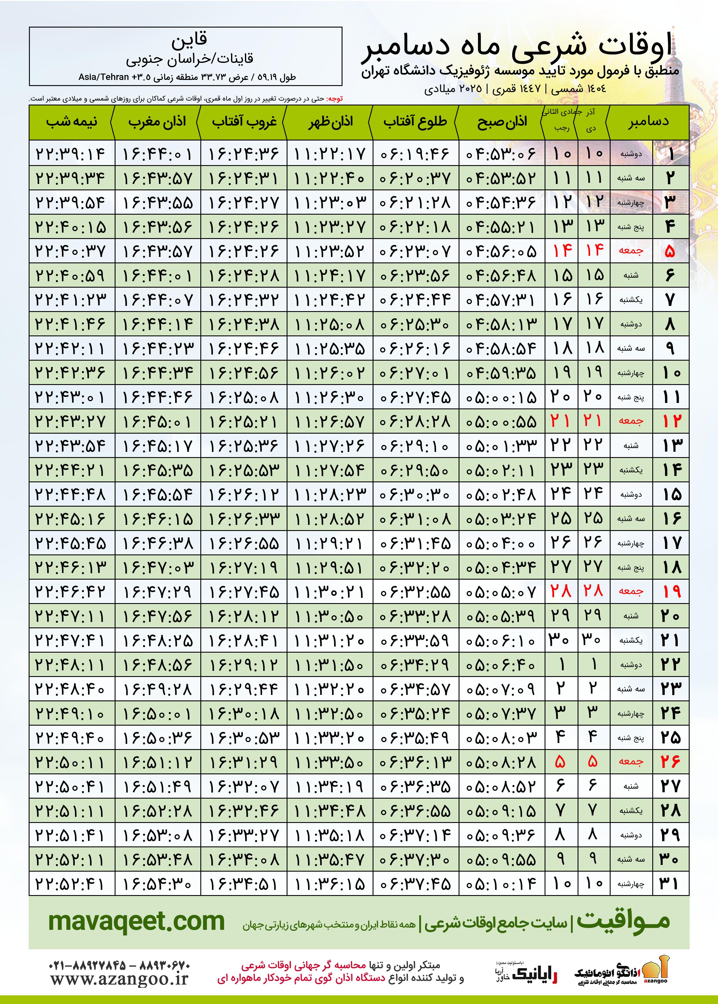 جدول اوقات شرعی دسامبر ٢٠٢٥ میلادی شهر قاین