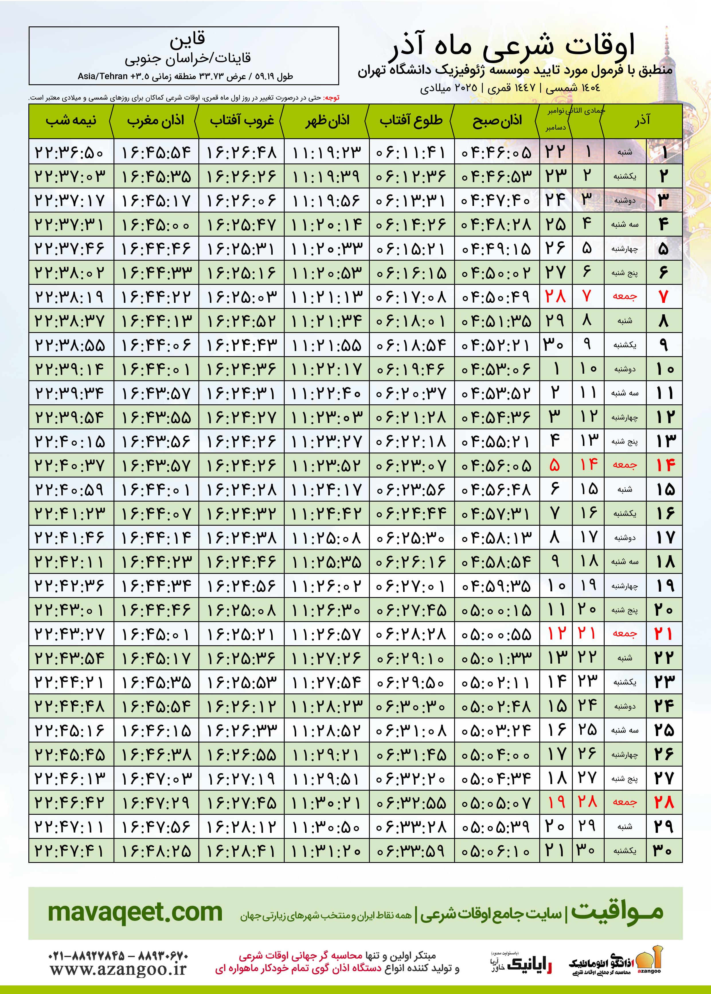 جدول اوقات شرعی آذر ١٤٠٤ شمسی شهر قاین