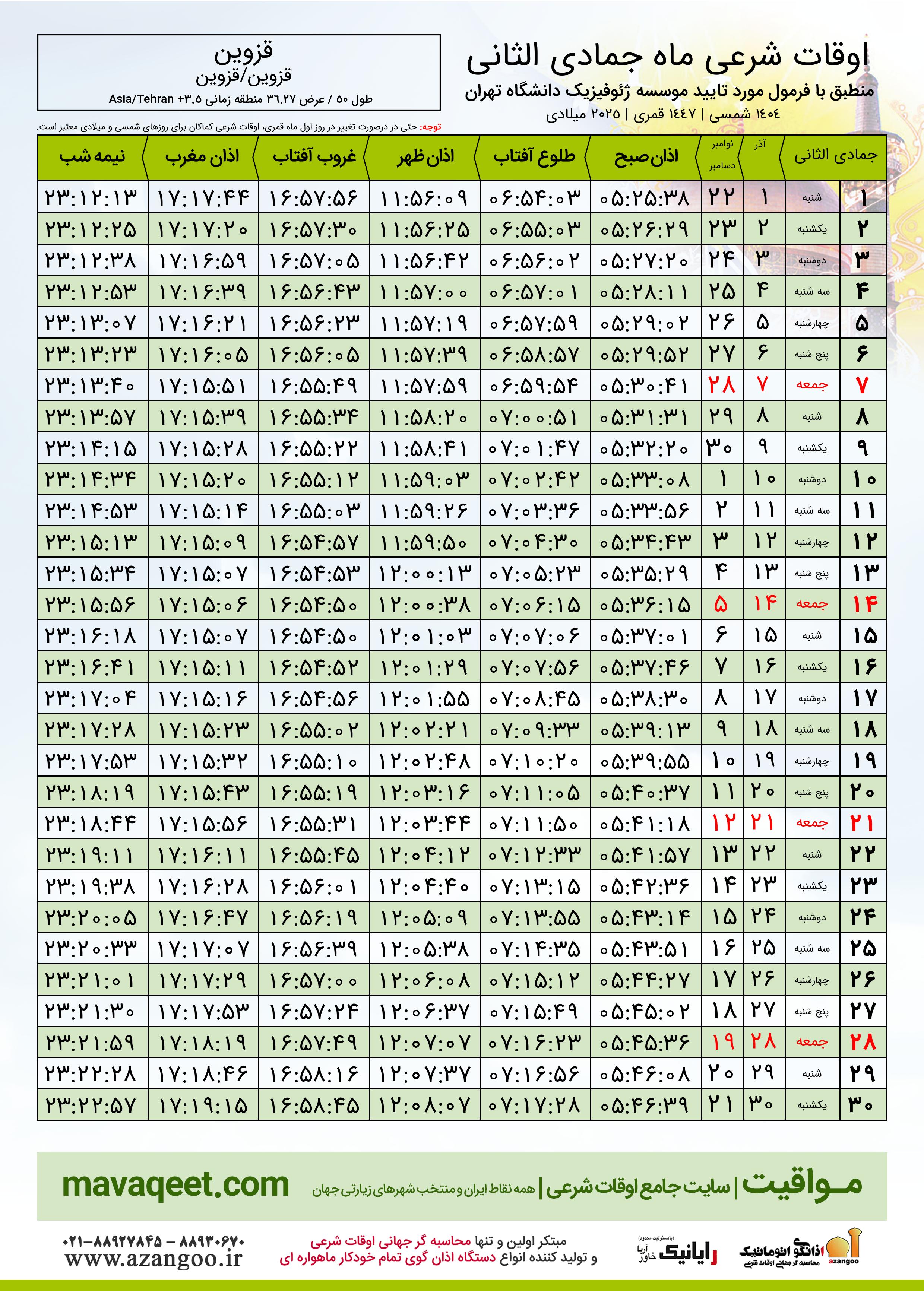 اوقات شرعی ماه جمادی الثانی ١٤٤٧ هـ.ق شهر قزوین بر