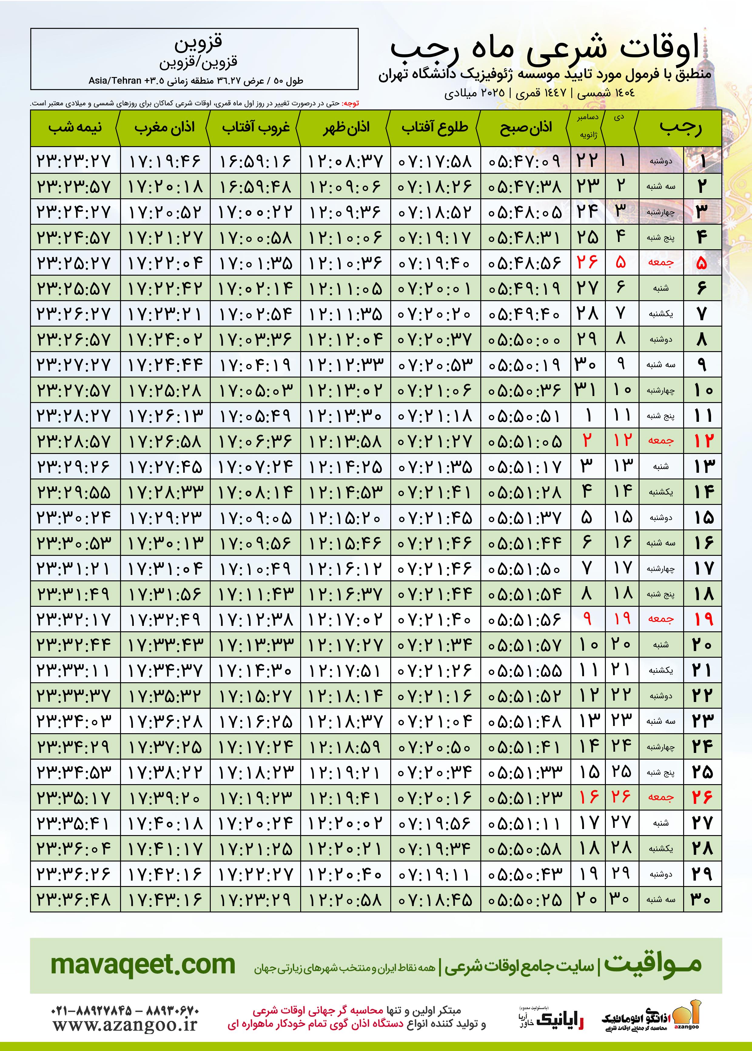 اوقات شرعی ماه رجب ١٤٤٧ هـ.ق شهر قزوین بر