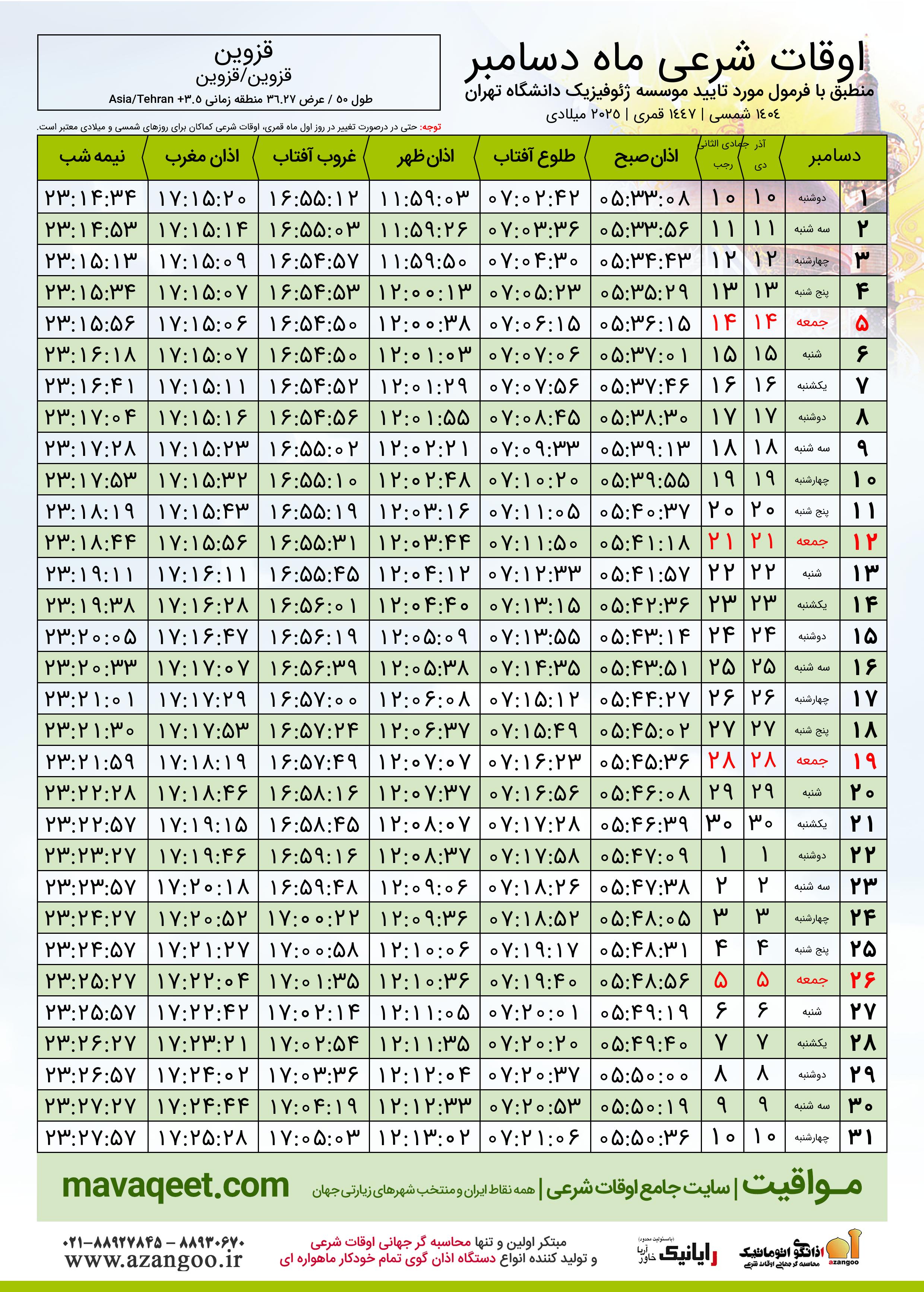 جدول اوقات شرعی دسامبر ٢٠٢٥ میلادی شهر قزوین