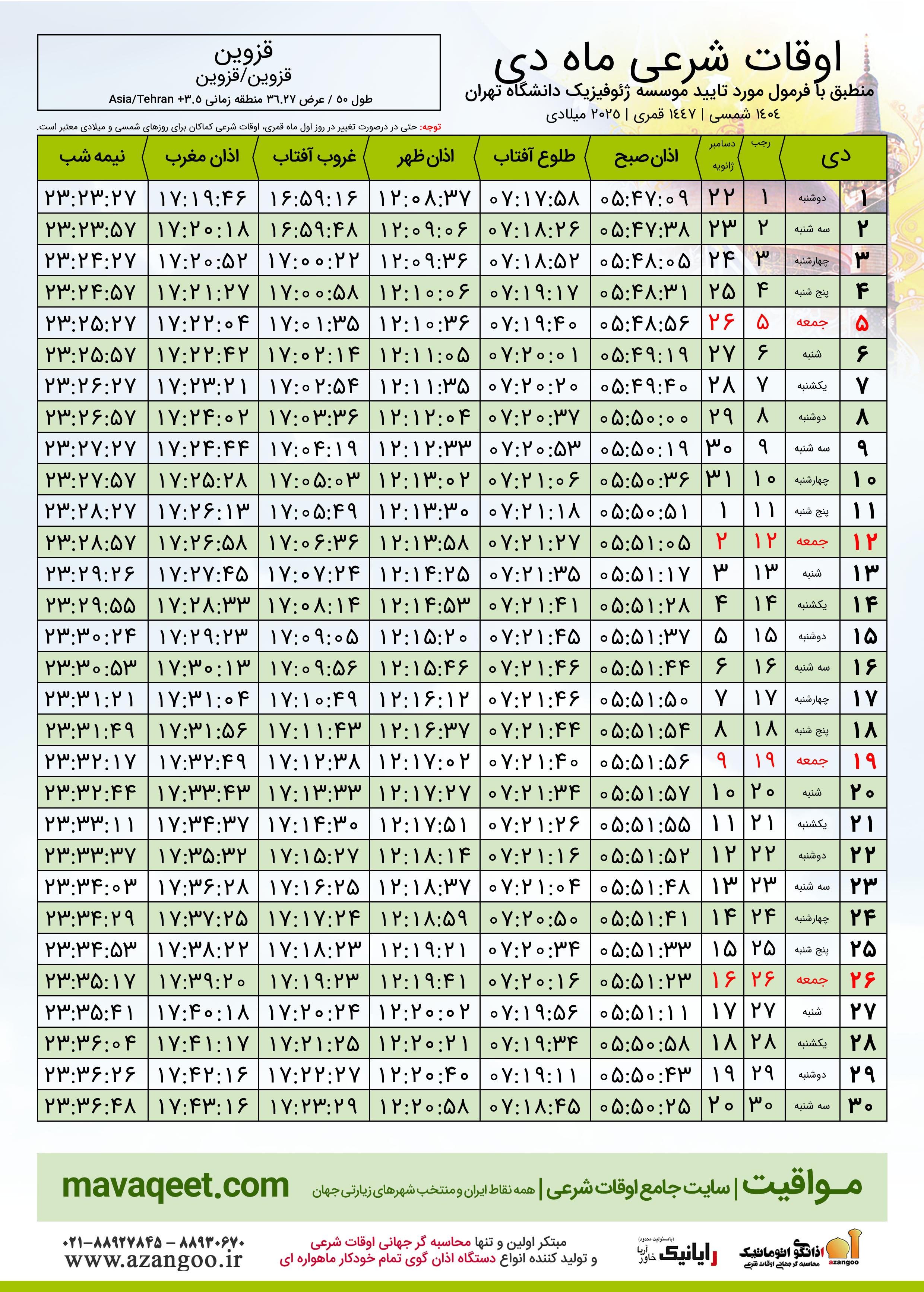 جدول اوقات شرعی دی ١٤٠٤ شمسی شهر قزوین