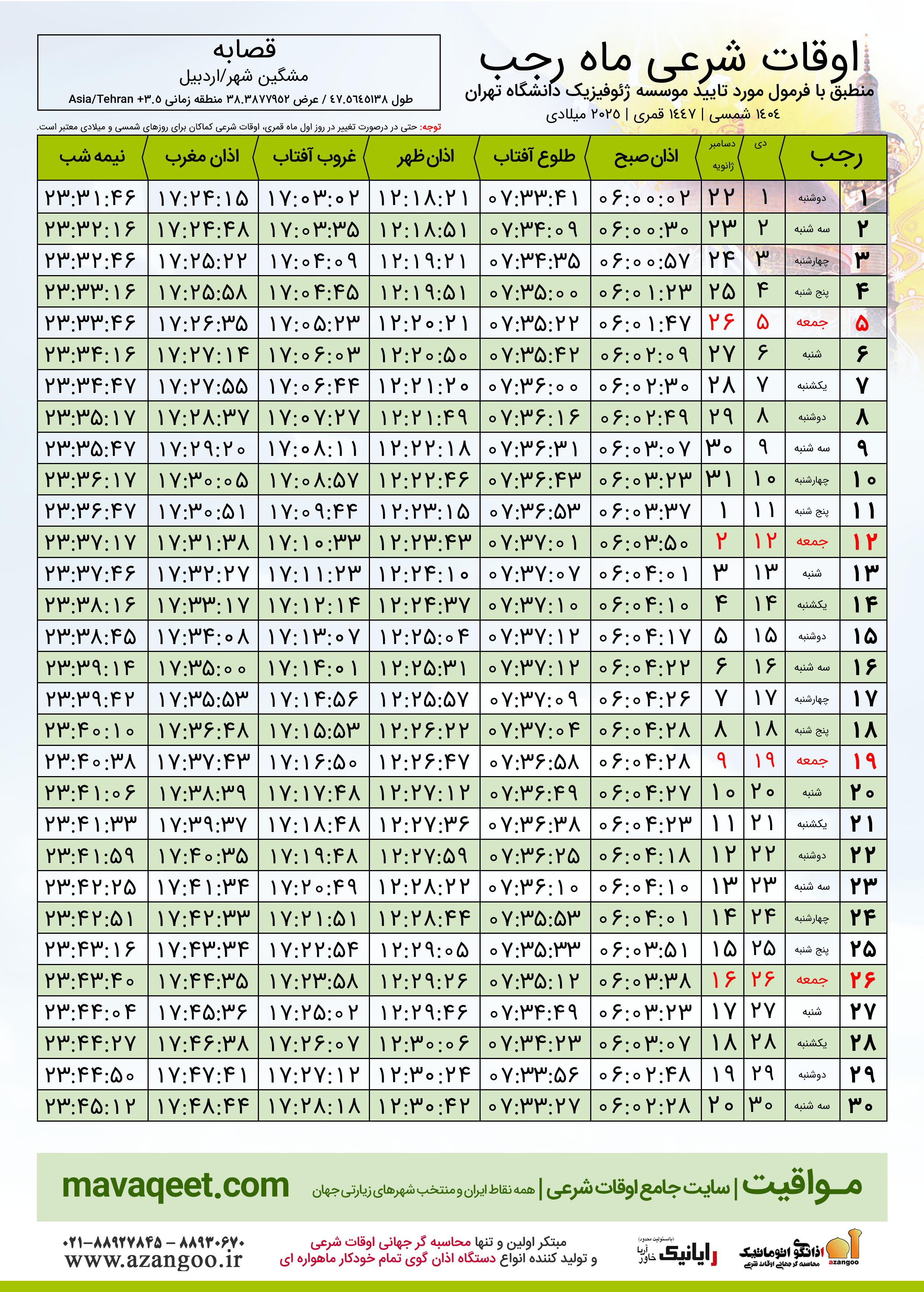 جدول اوقات شرعی رجب ١٤٤٧ قمری شهر قصابه