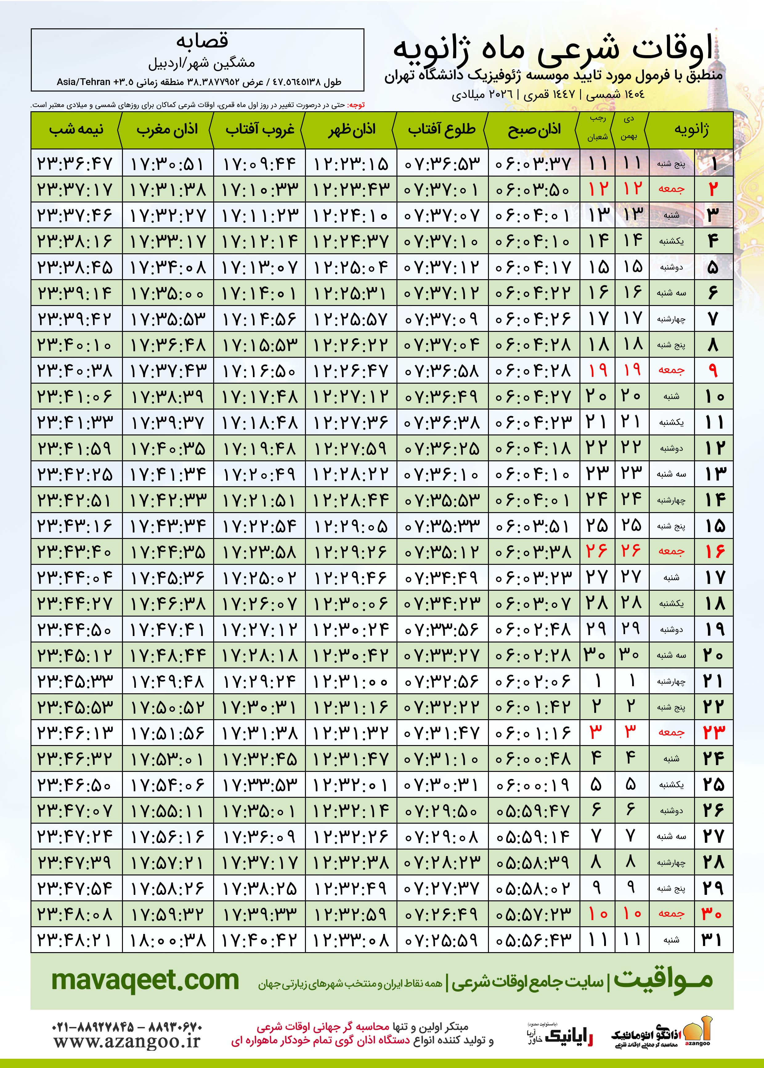 جدول اوقات شرعی ماه رمضان شهر قصابه ٠٤ - ١٤٠٤ شمسی | ٢٠٢٦ میلادی | ١٤٤٧ قمری