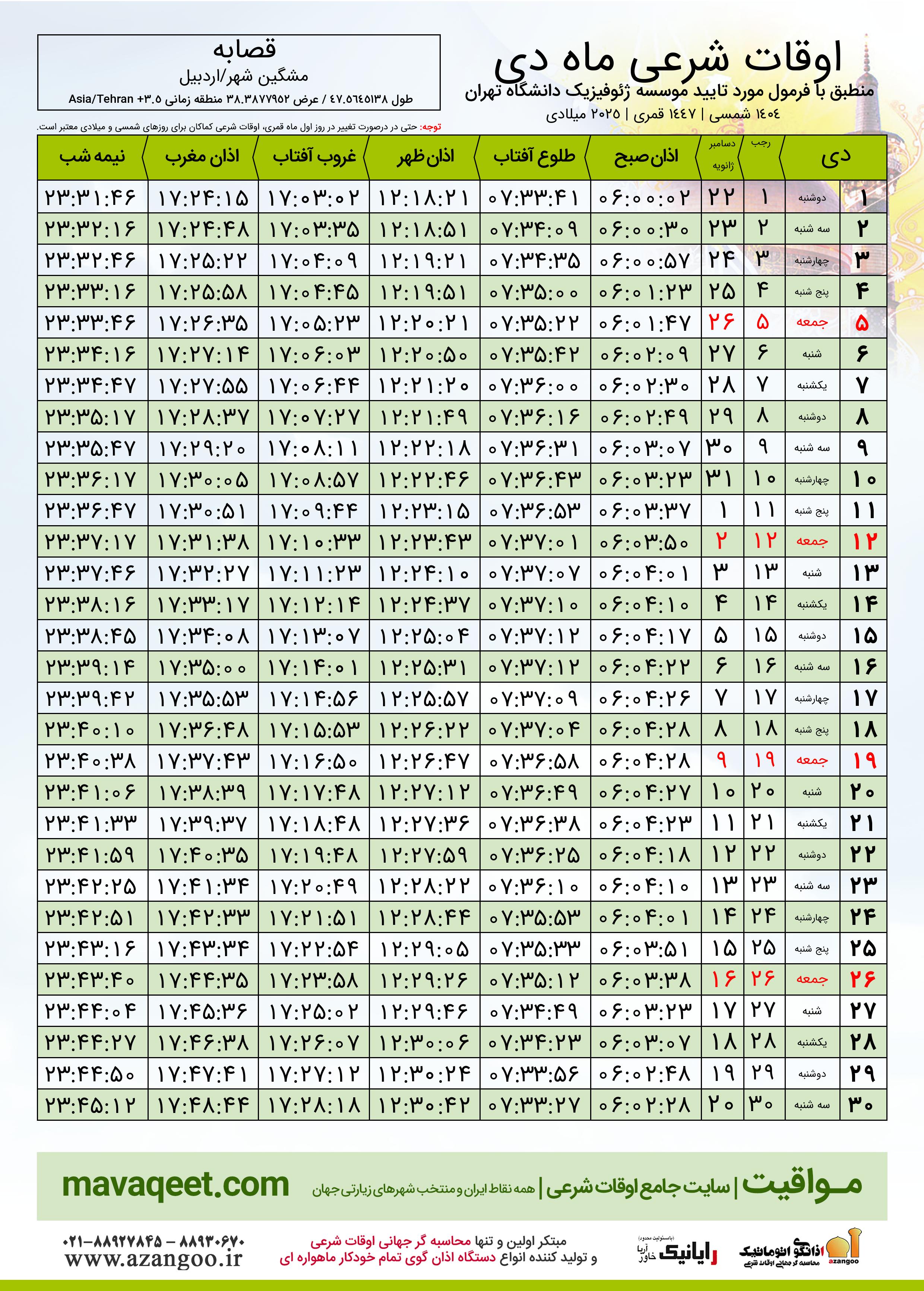 اوقات شرعی دی ١٤٠٤ شمسی شهر قصابه