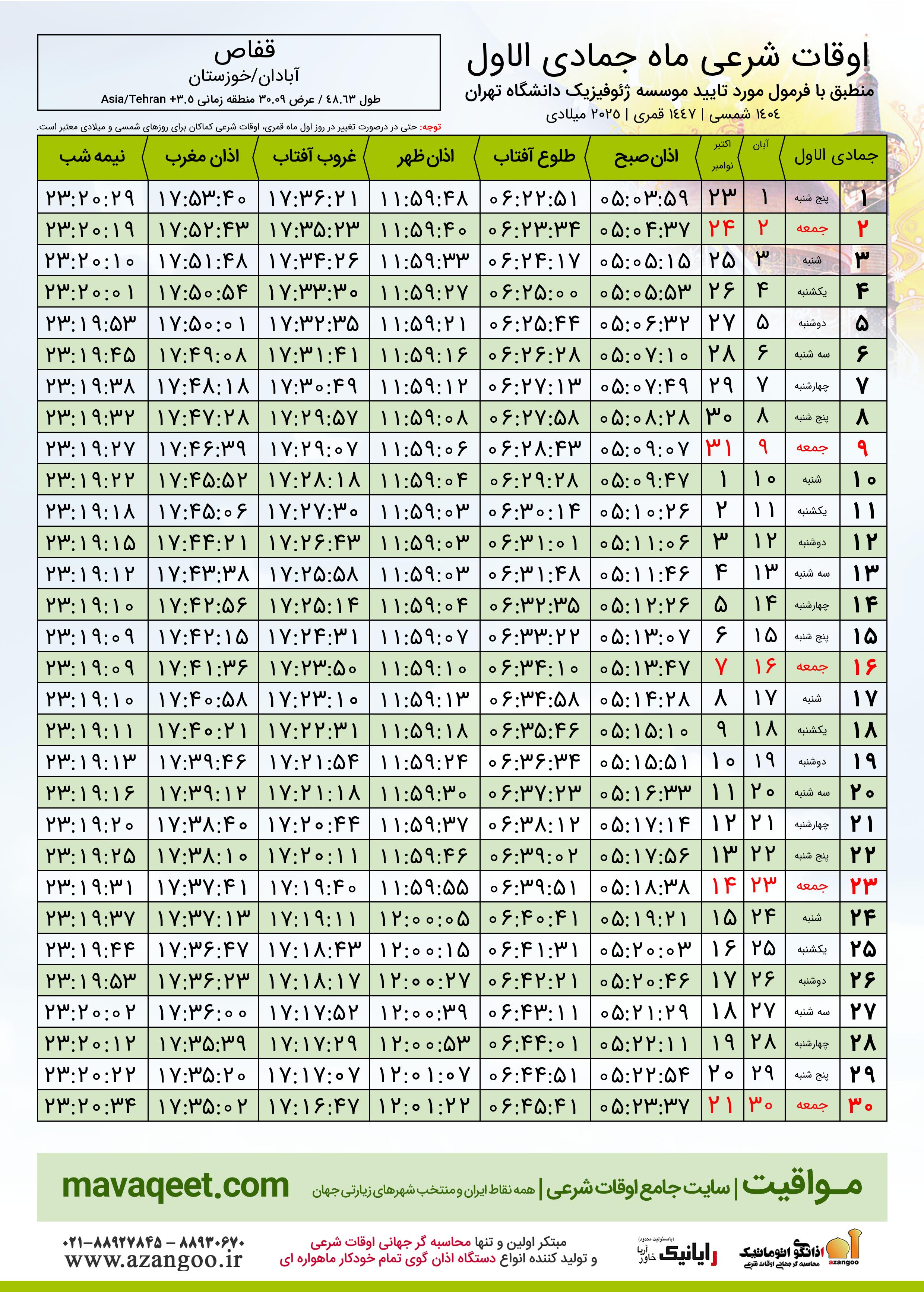 جدول اوقات شرعی جمادی الاول ١٤٤٧ قمری شهر قفاص