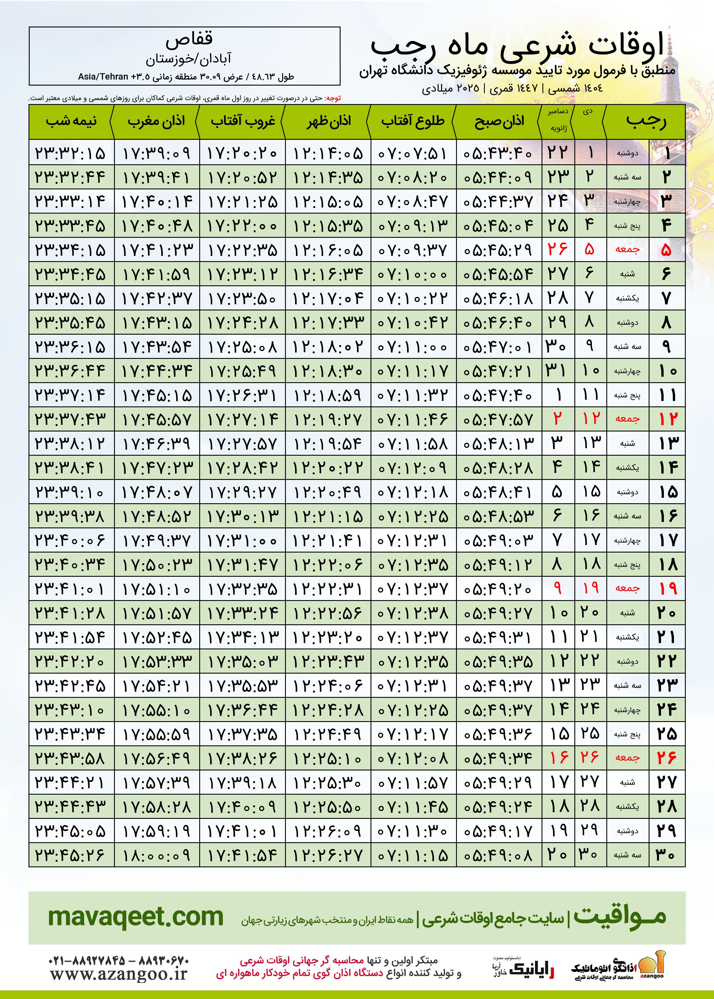 جدول اوقات شرعی رجب ١٤٤٧ قمری شهر قفاص