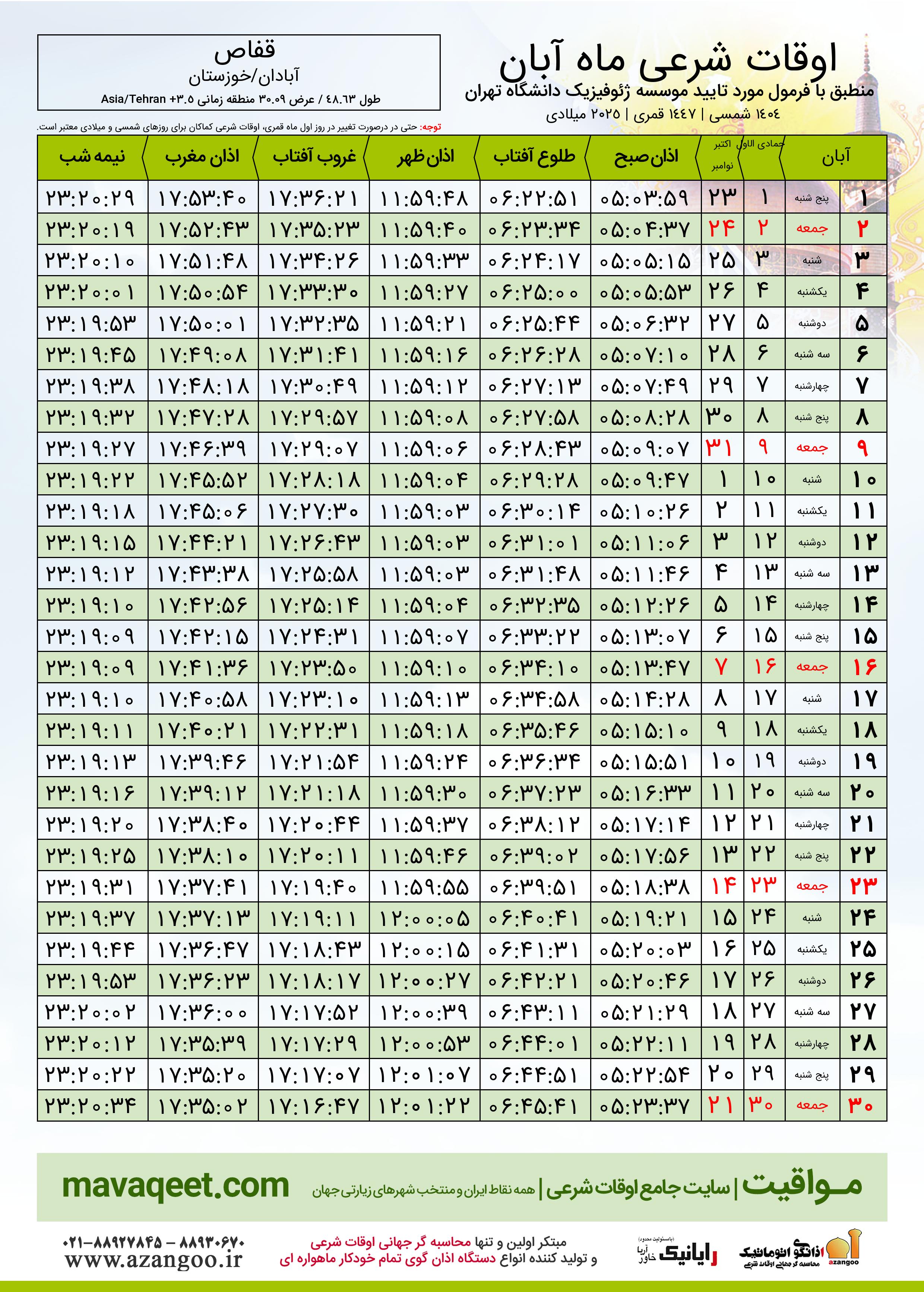جدول اوقات شرعی آبان ١٤٠٤ شمسی شهر قفاص