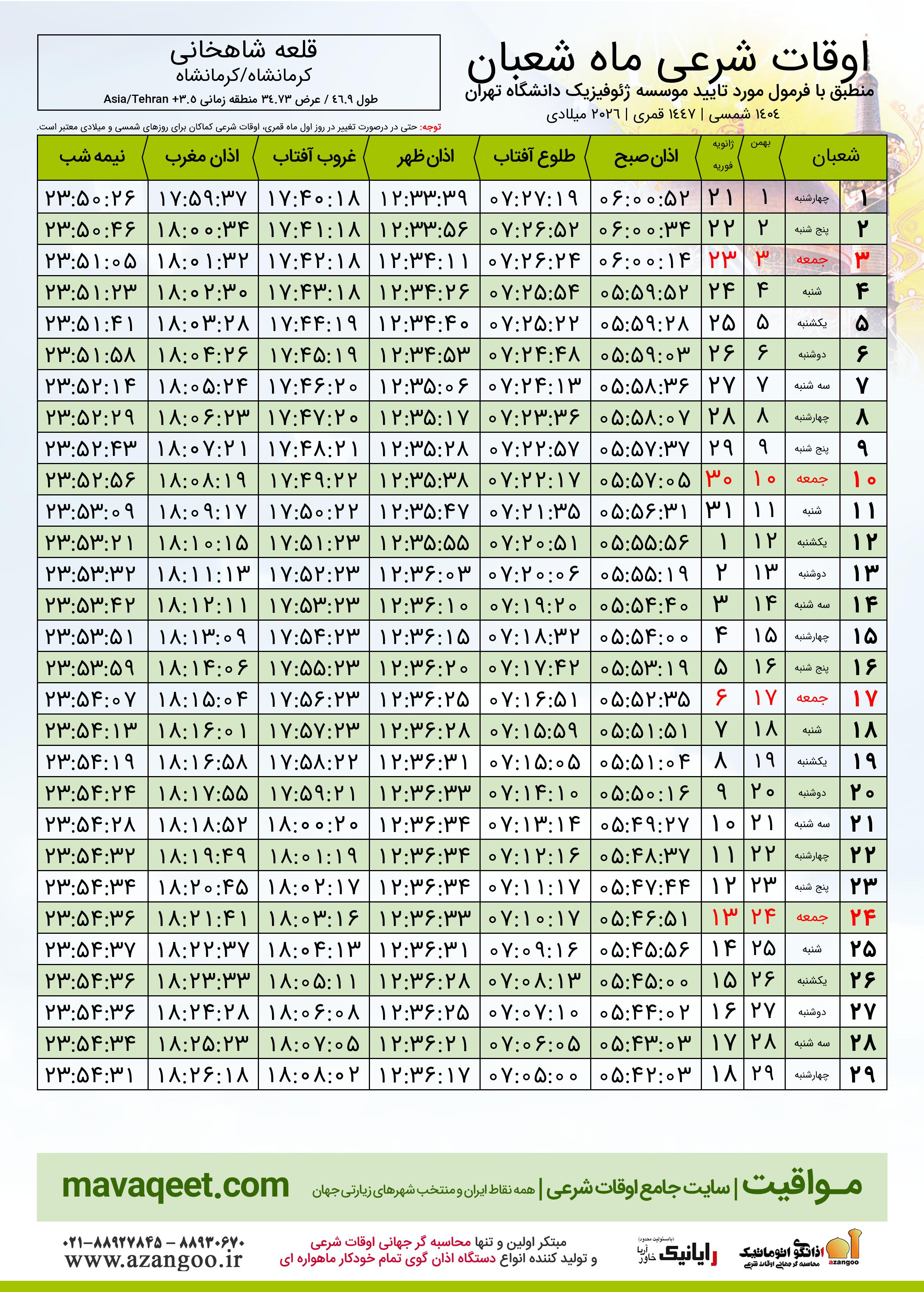 اوقات شرعی ماه شعبان ١٤٤٧ هـ.ق شهر قلعه شاهخانی بر