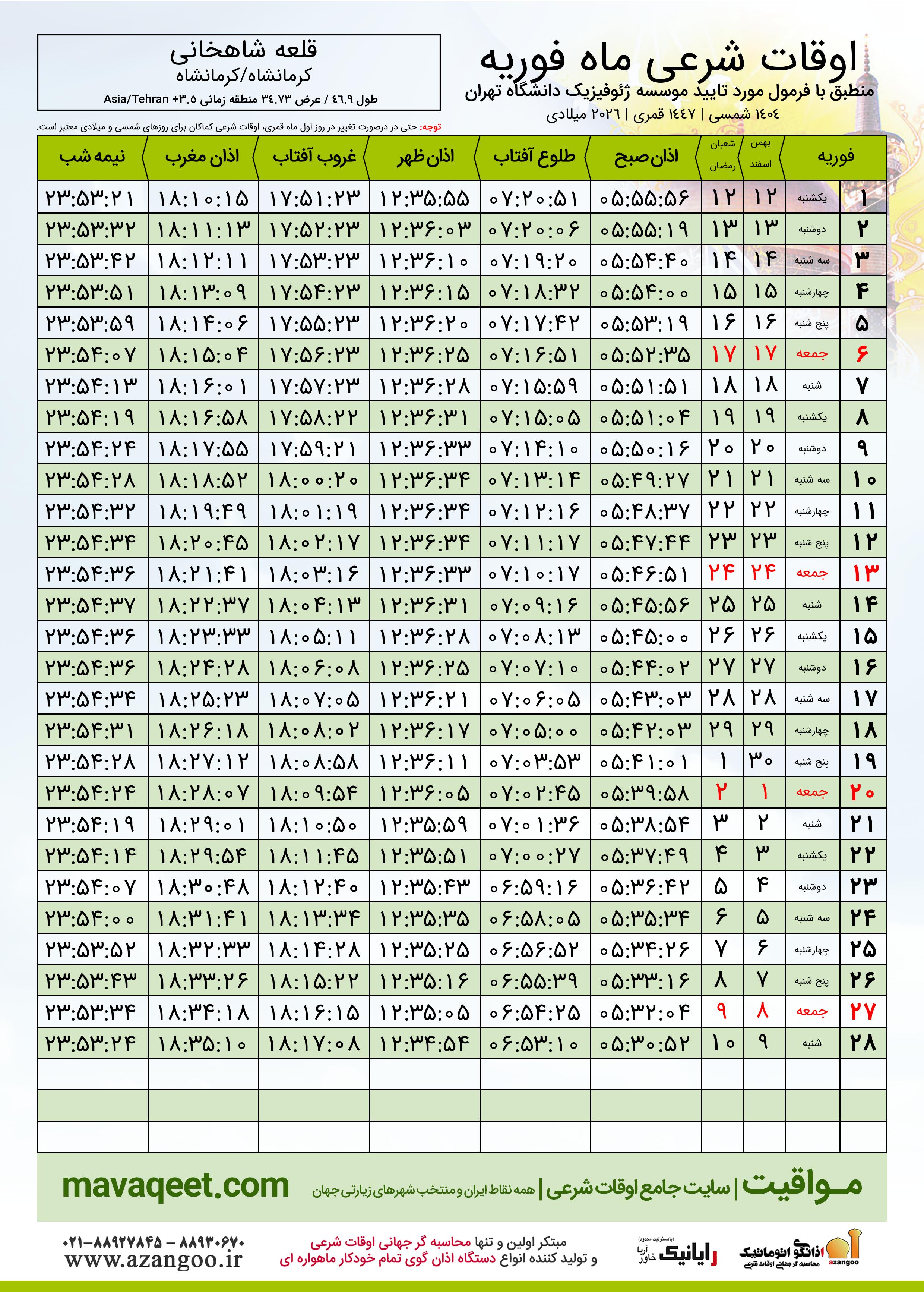 دانلود اوقات شرعی فوریه ٢٠٢٦ شهر قلعه شاهخانی