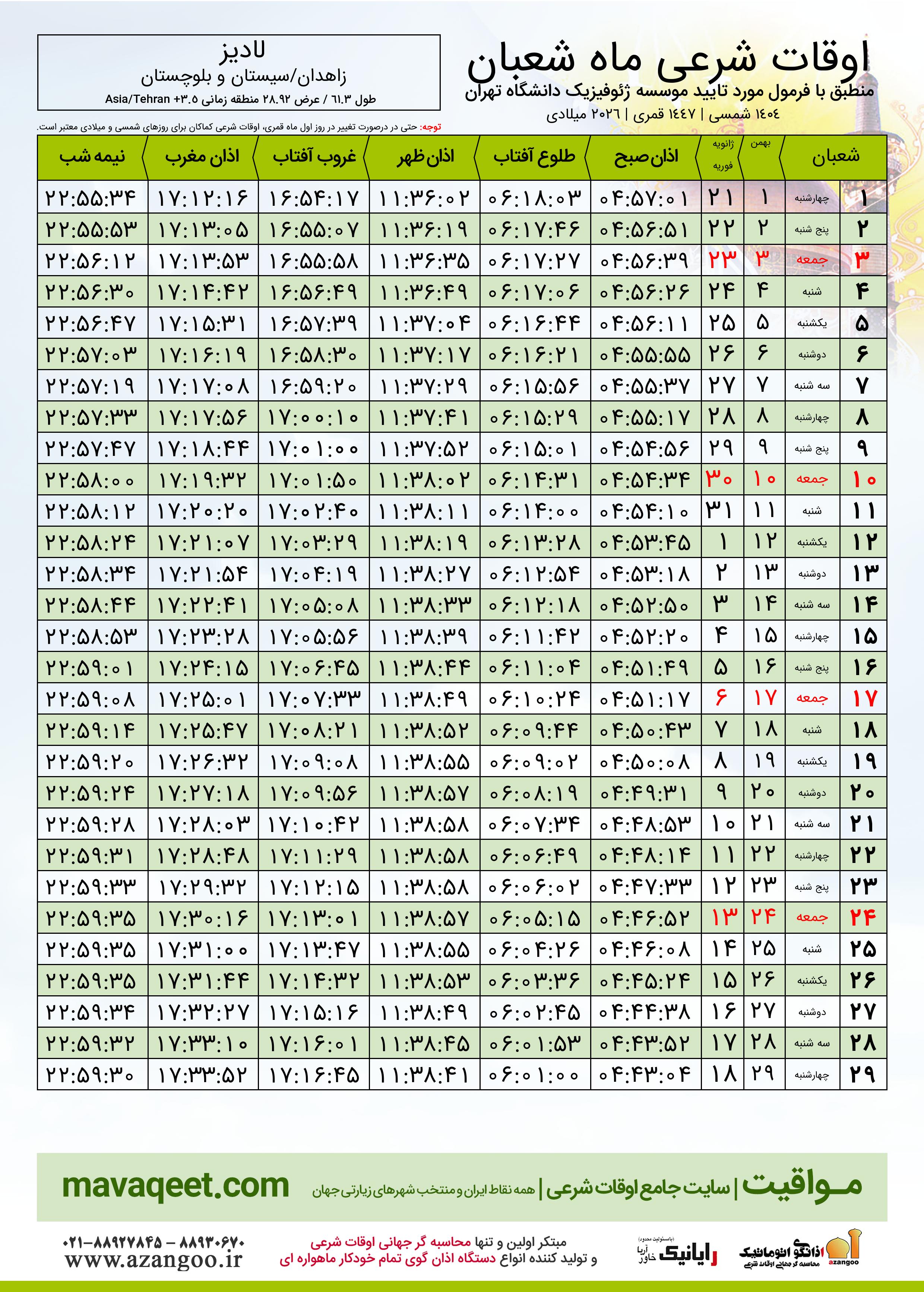 اوقات شرعی ماه شعبان ١٤٤٧ هـ.ق شهر لادیز بر