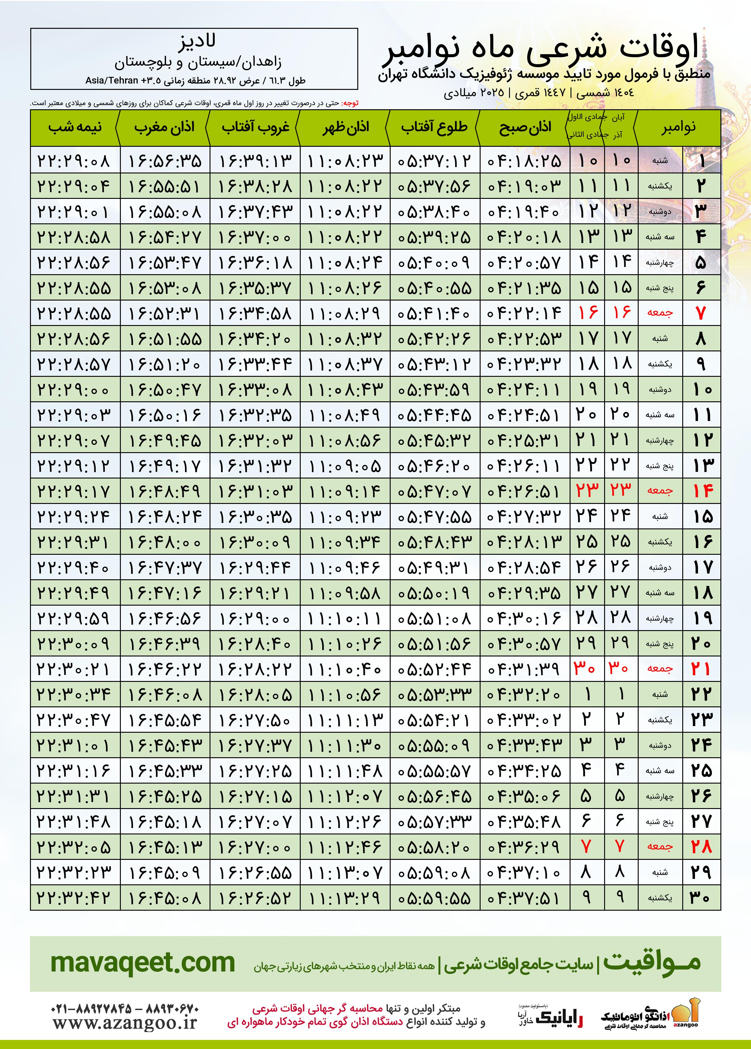 جدول اوقات شرعی آبان ١٤٠٤ شمسی شهر لادیز