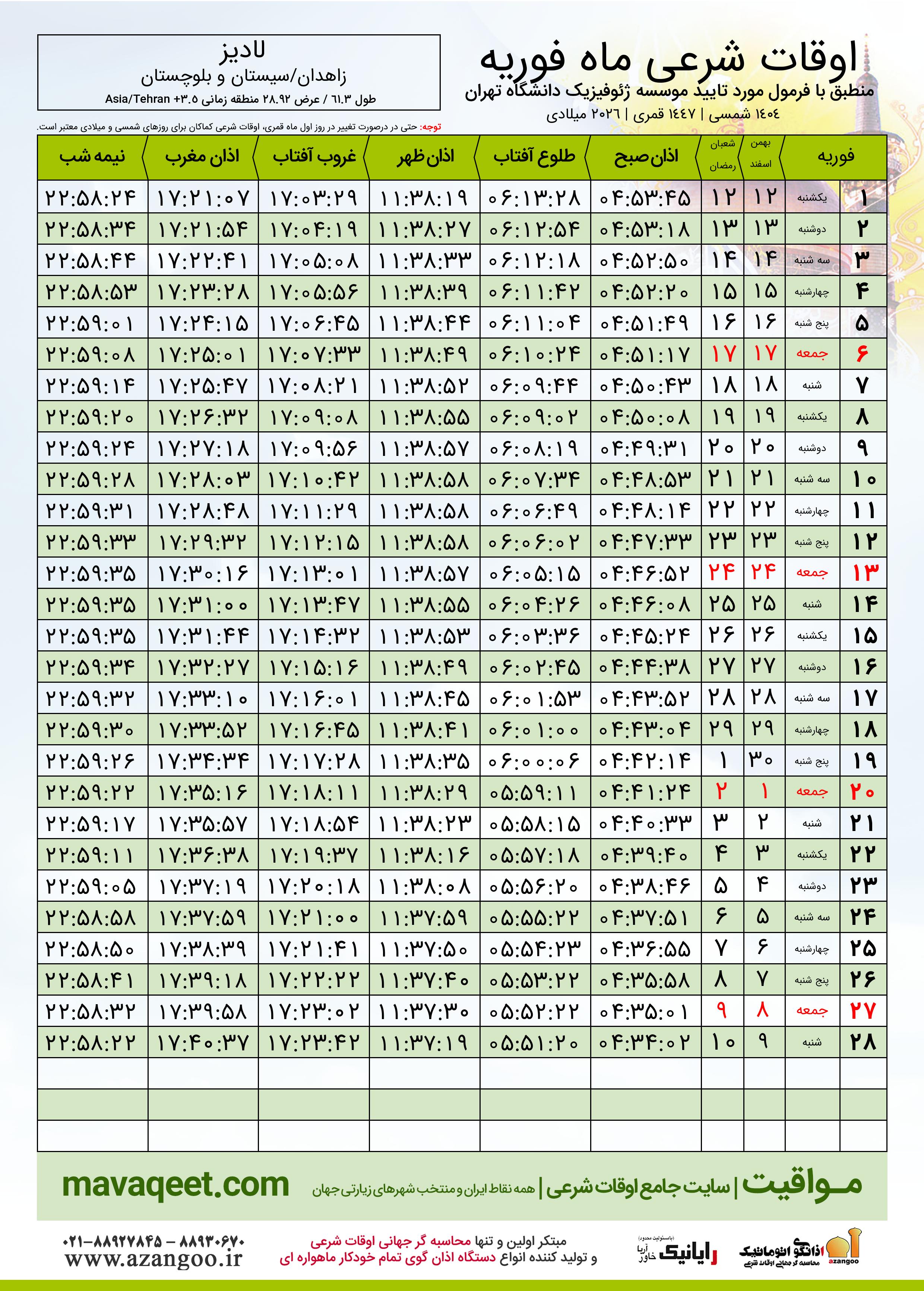 اوقات شرعی ماه رمضان شهر لادیز ١٤٠٤ - ٠٤ شمسی | ٢٠٢٦ میلادی