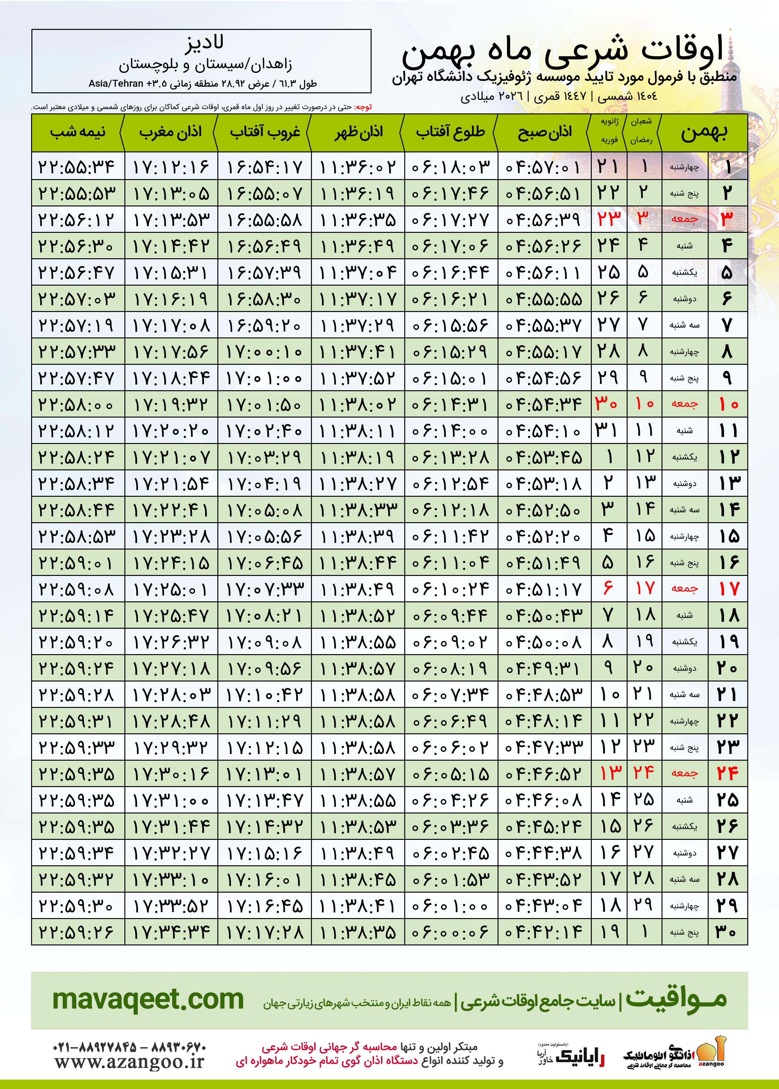 دانلود اوقات شرعی بهمن ٠٤ - ١٤٠٤ شهر لادیز