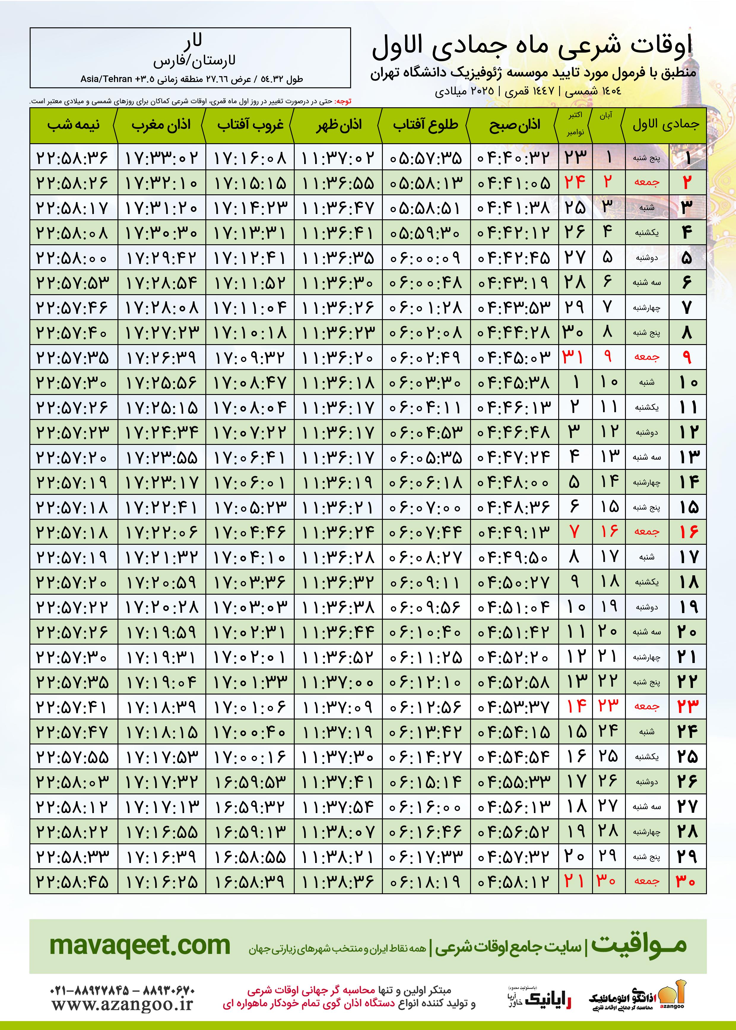 اوقات شرعی ماه جمادی الاول ١٤٤٧ هـ.ق شهر لار بر