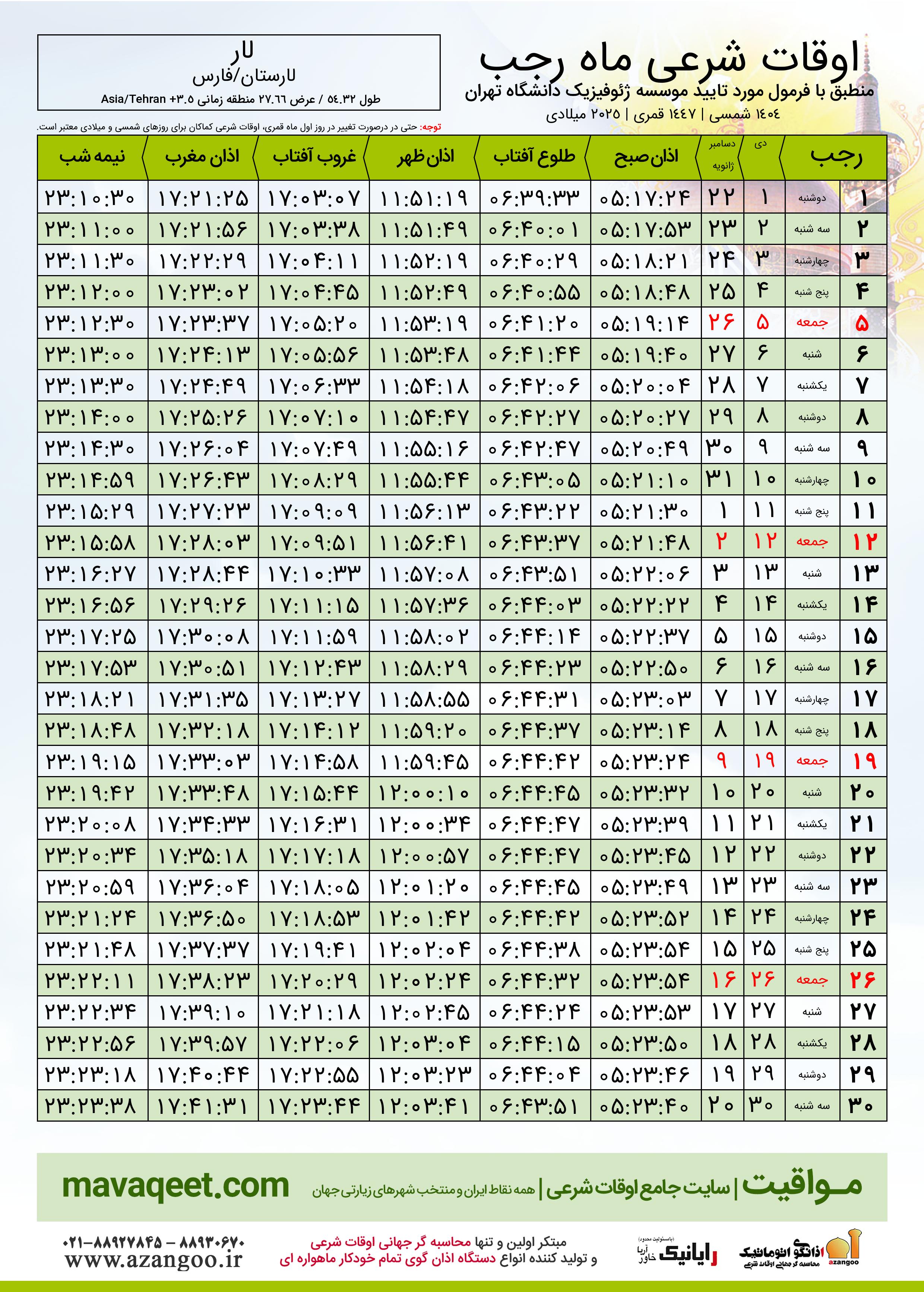 اوقات شرعی ماه رجب ١٤٤٧ هـ.ق شهر لار بر