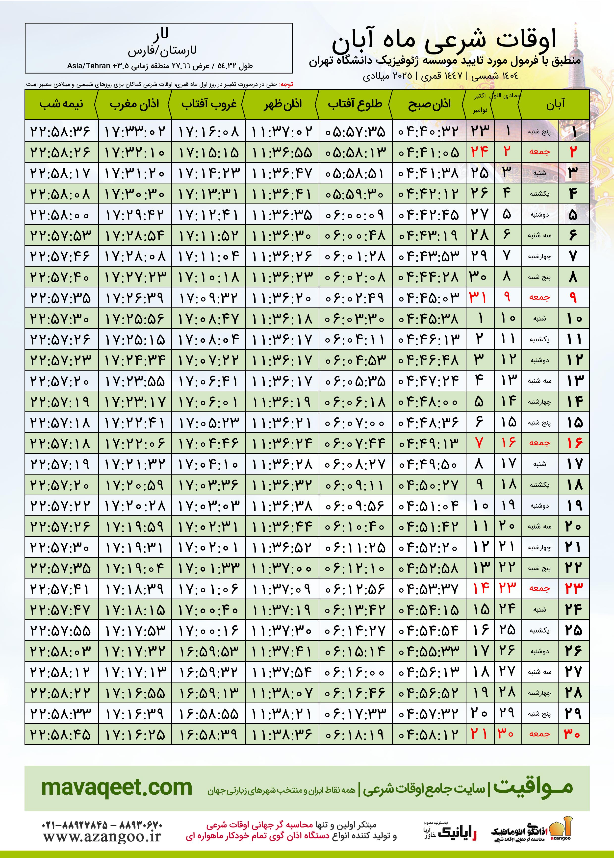 جدول اوقات شرعی آبان ١٤٠٤ شمسی شهر لار