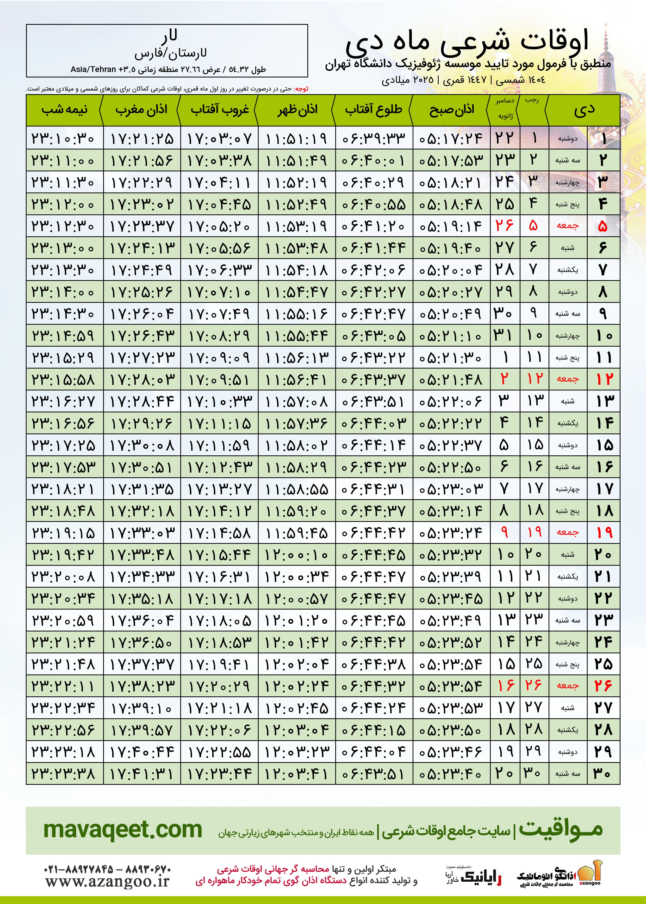 جدول اوقات شرعی دسامبر ٢٠٢٥ میلادی شهر لار