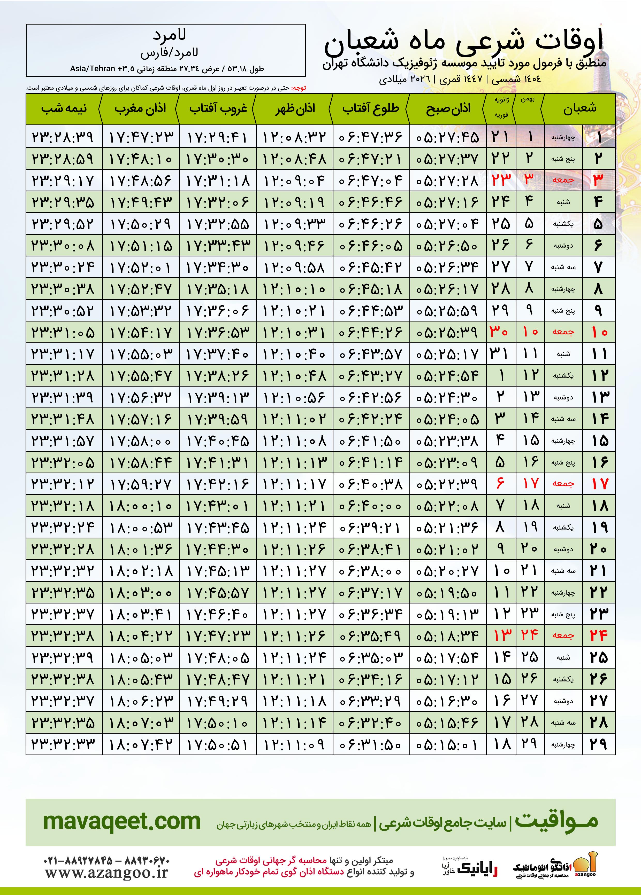 جدول اوقات شرعی شعبان ١٤٤٧ قمری شهر لامرد