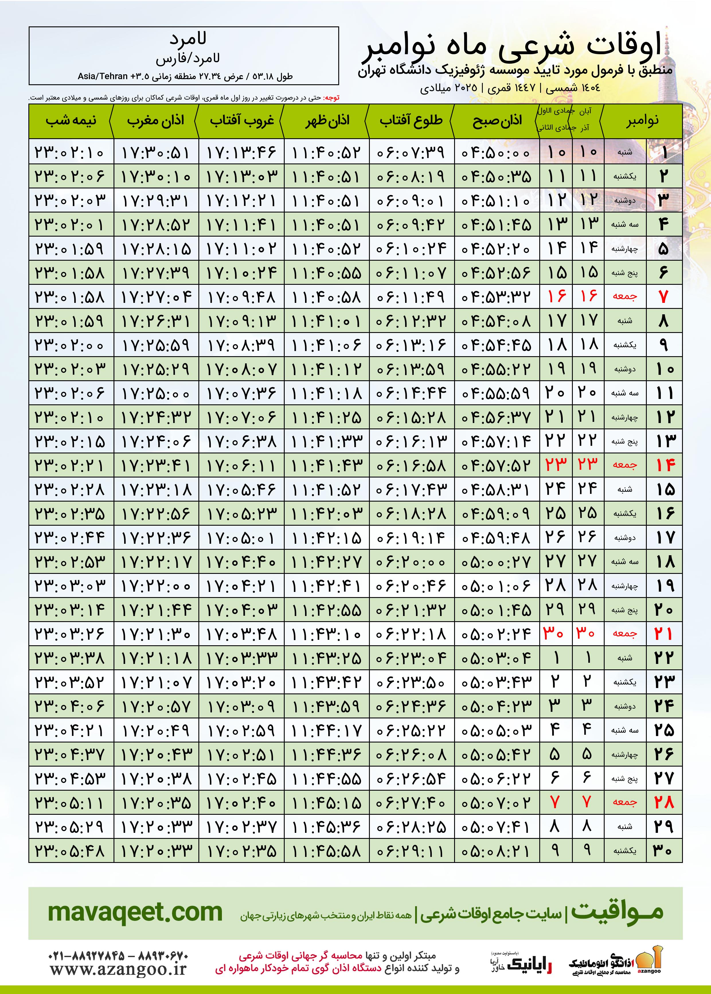جهت نمایش تصویر جدول اوقات شرعی جدول اوقات شرعی نوامبر ٢٠٢٥ میلادی شهر لامرد شهر لامرد در اندازه