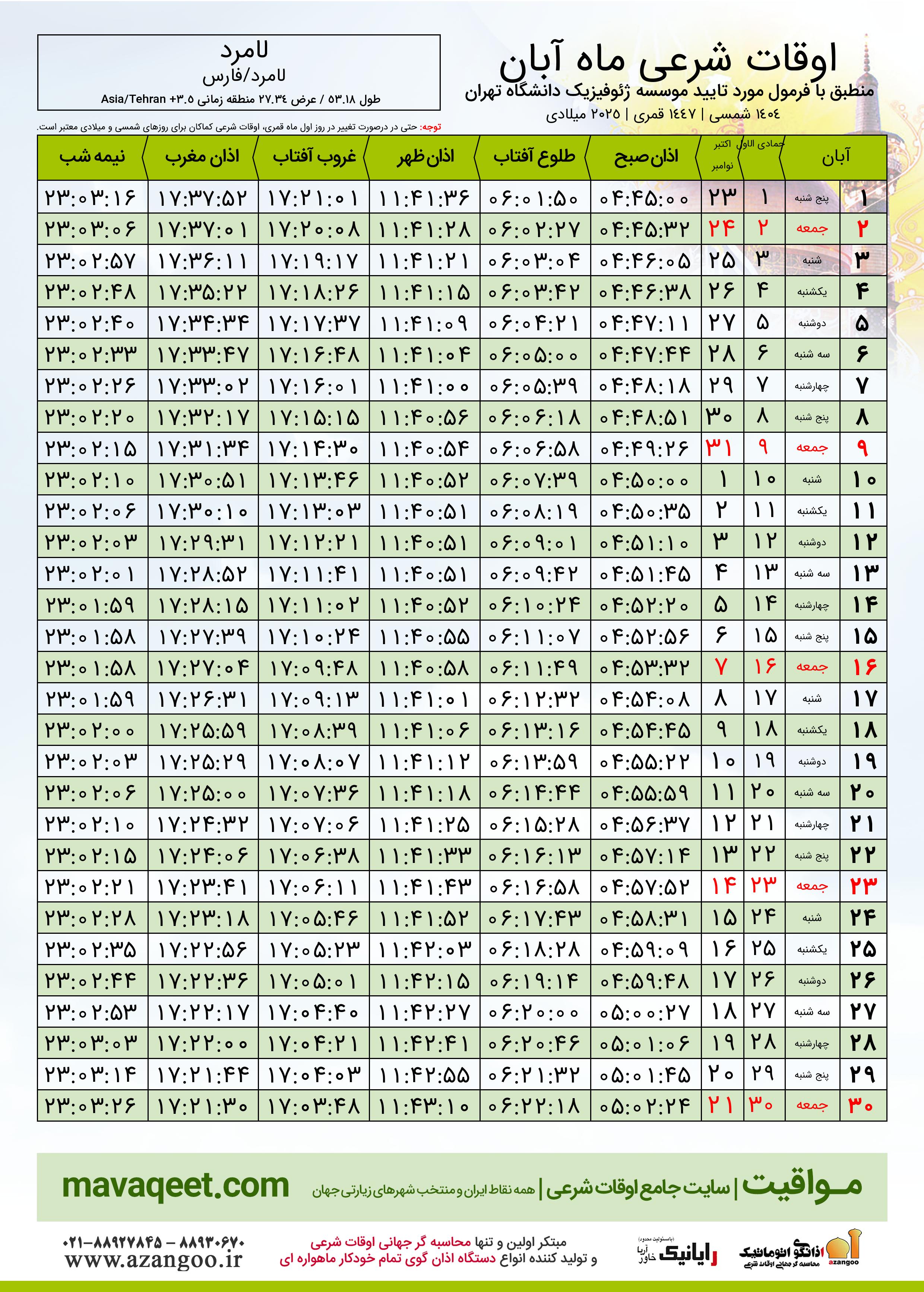 جدول اوقات شرعی آبان ١٤٠٤ شمسی شهر لامرد