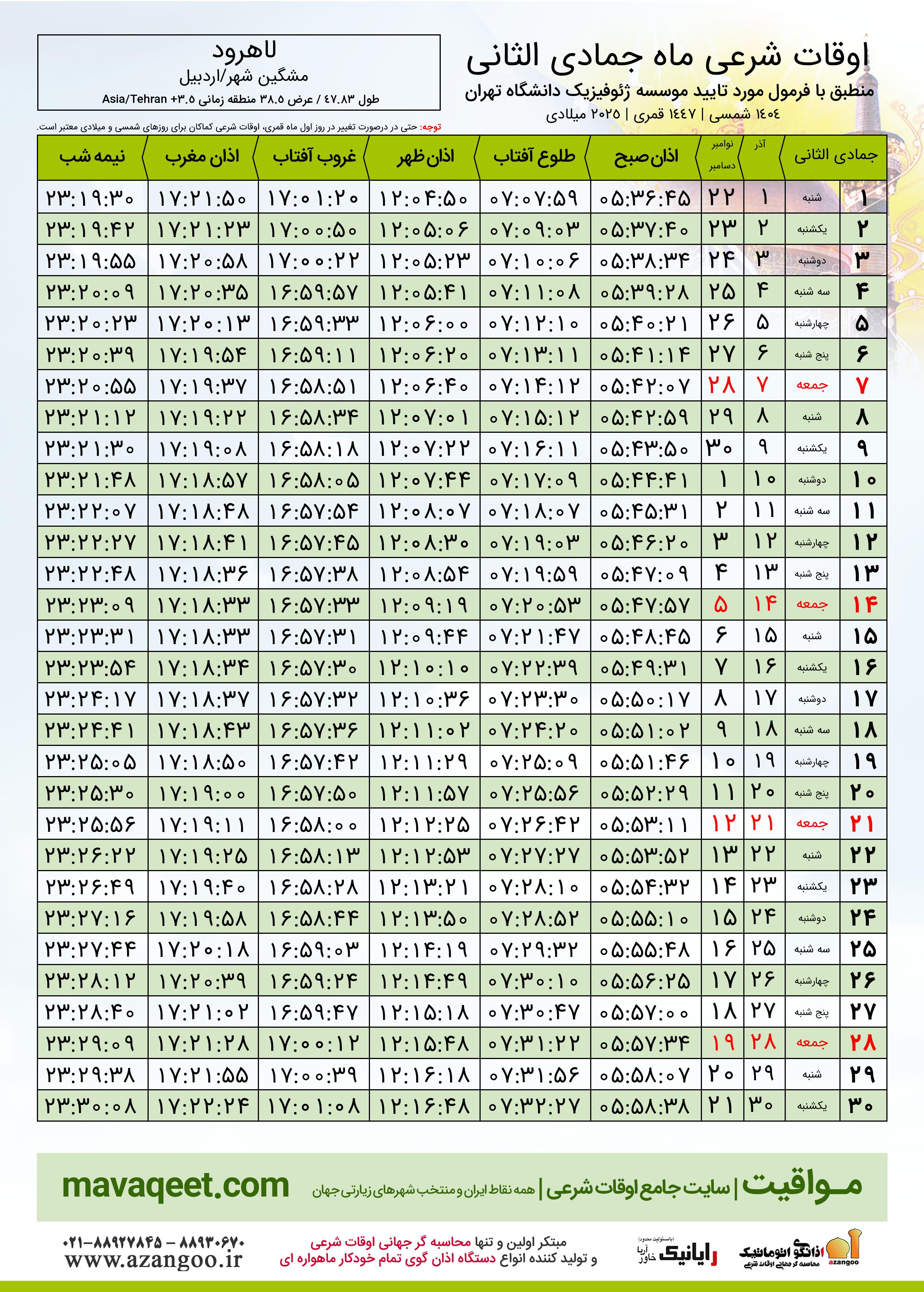 اوقات شرعی ماه جمادی الثانی ١٤٤٧ هـ.ق شهر لاهرود بر
