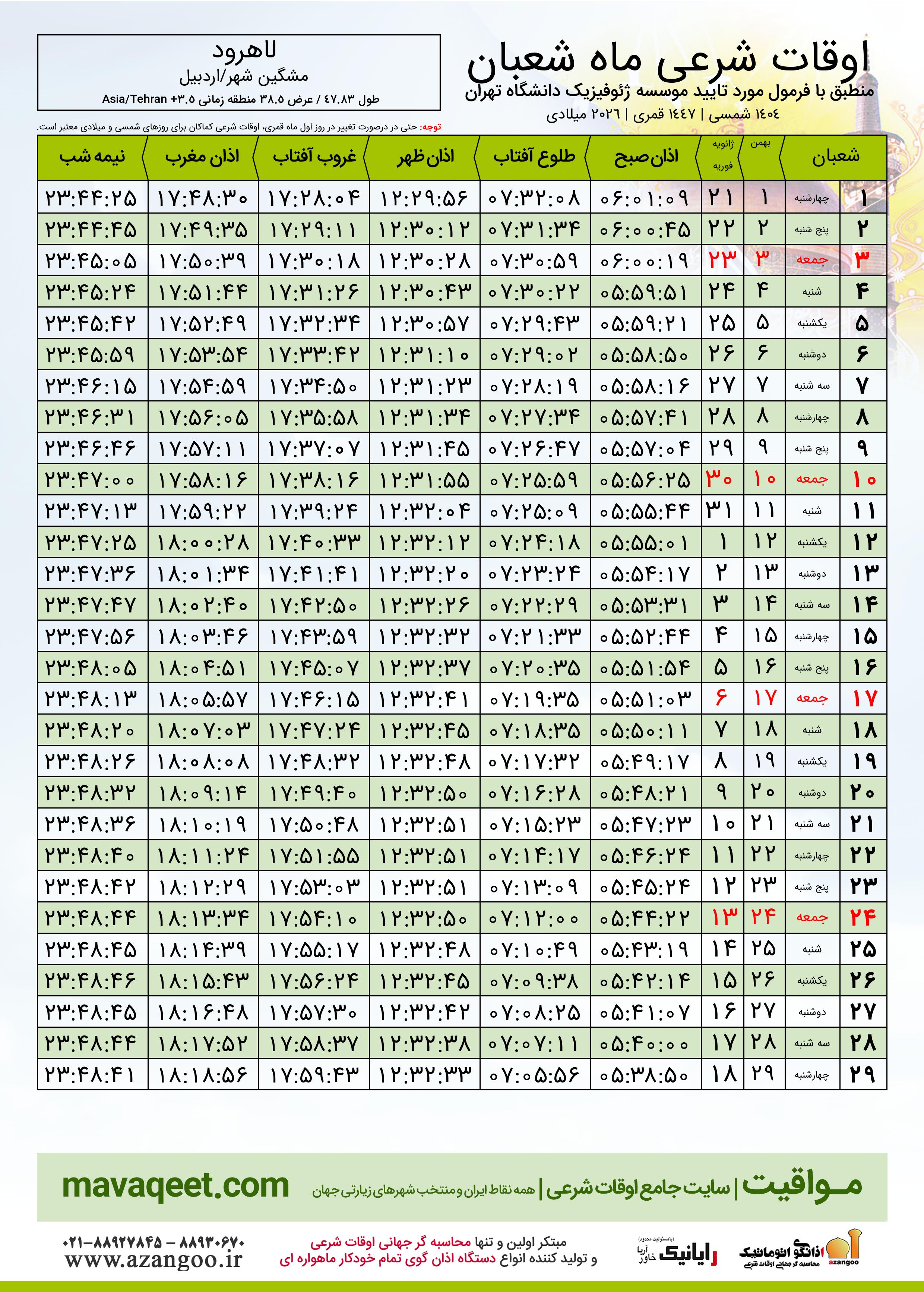 اوقات شرعی ماه شعبان ١٤٤٧ هـ.ق شهر لاهرود بر