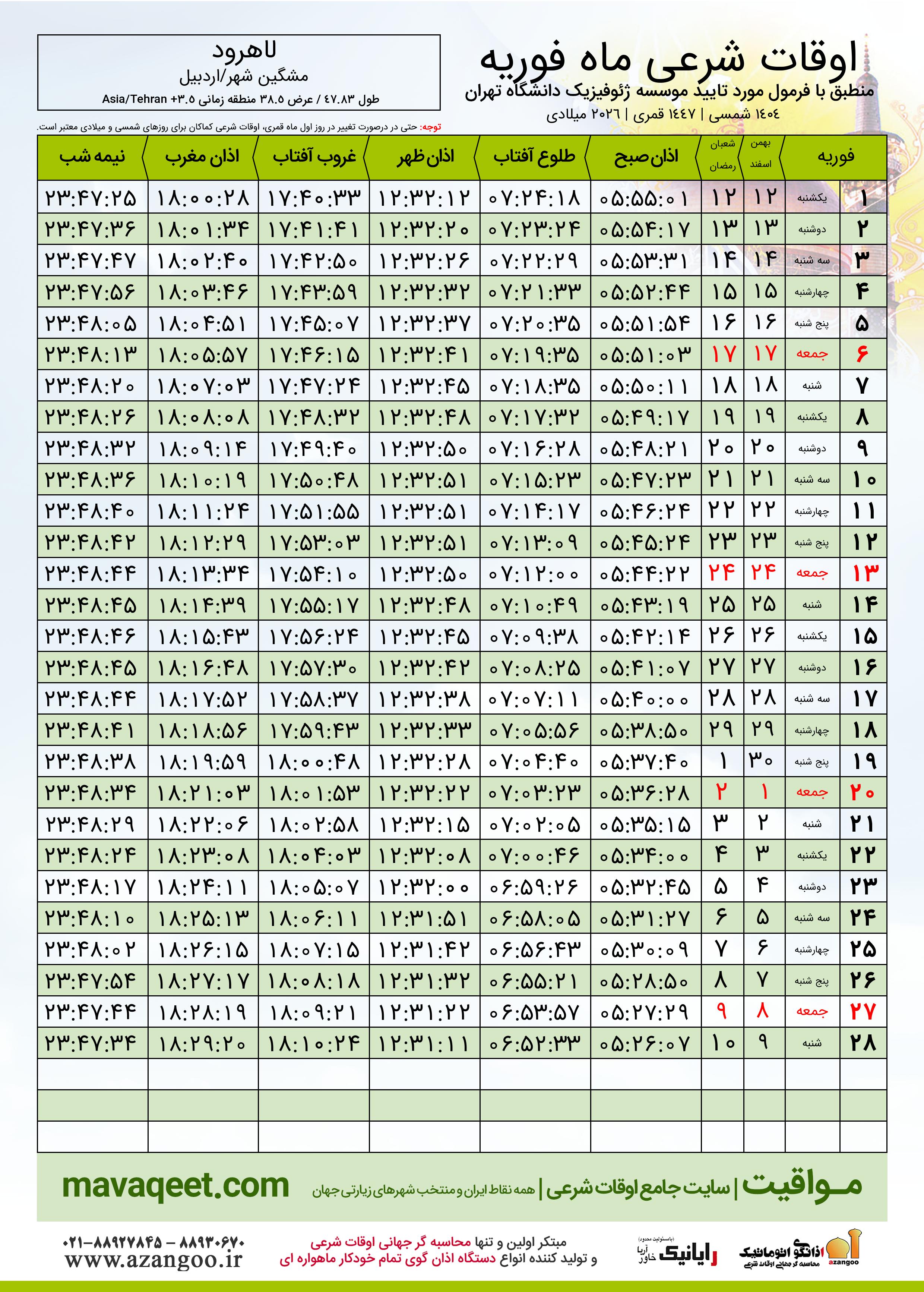 دانلود اوقات شرعی فوریه ٢٠٢٦ شهر لاهرود