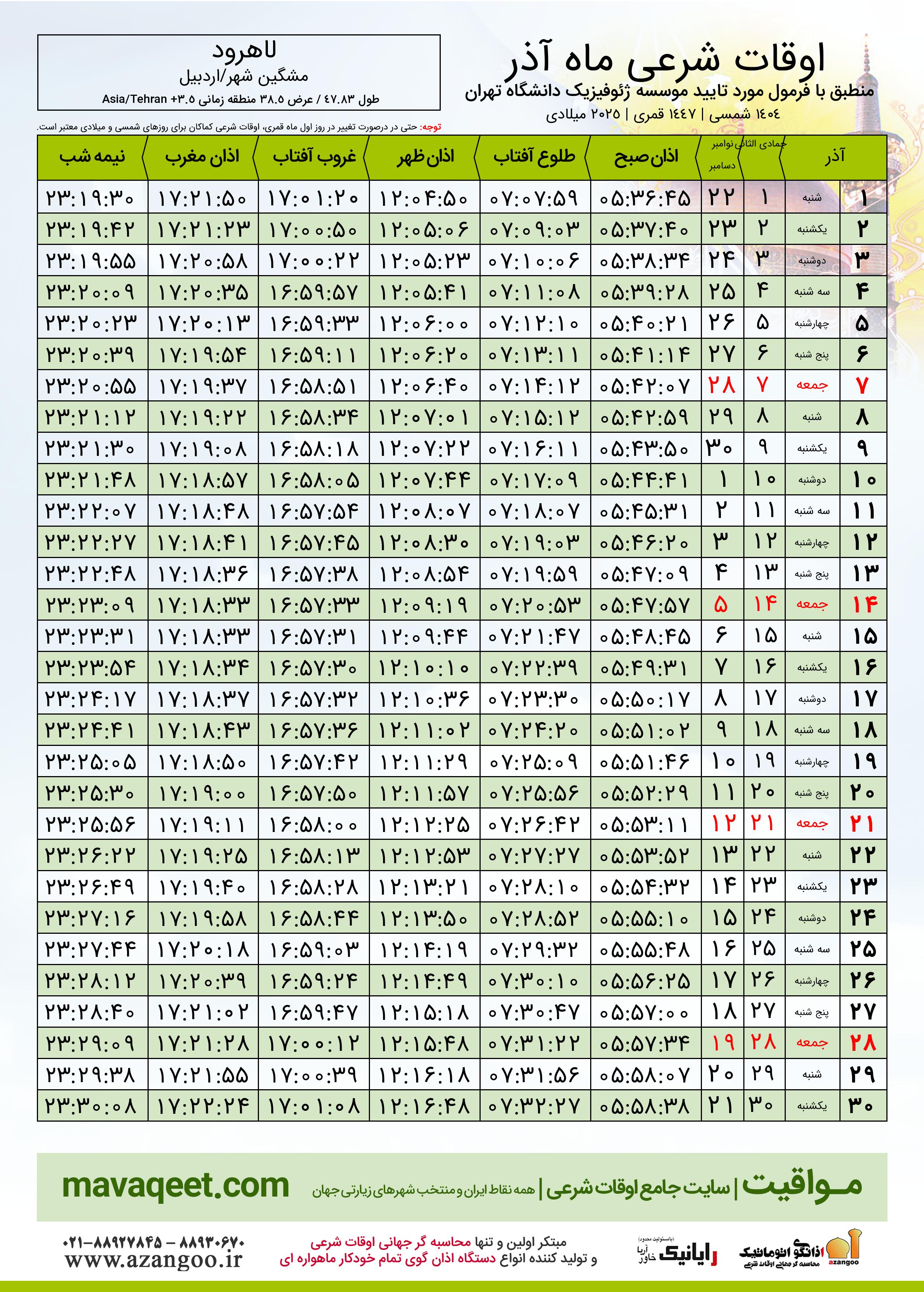 جدول اوقات شرعی آذر ١٤٠٤ شمسی شهر لاهرود