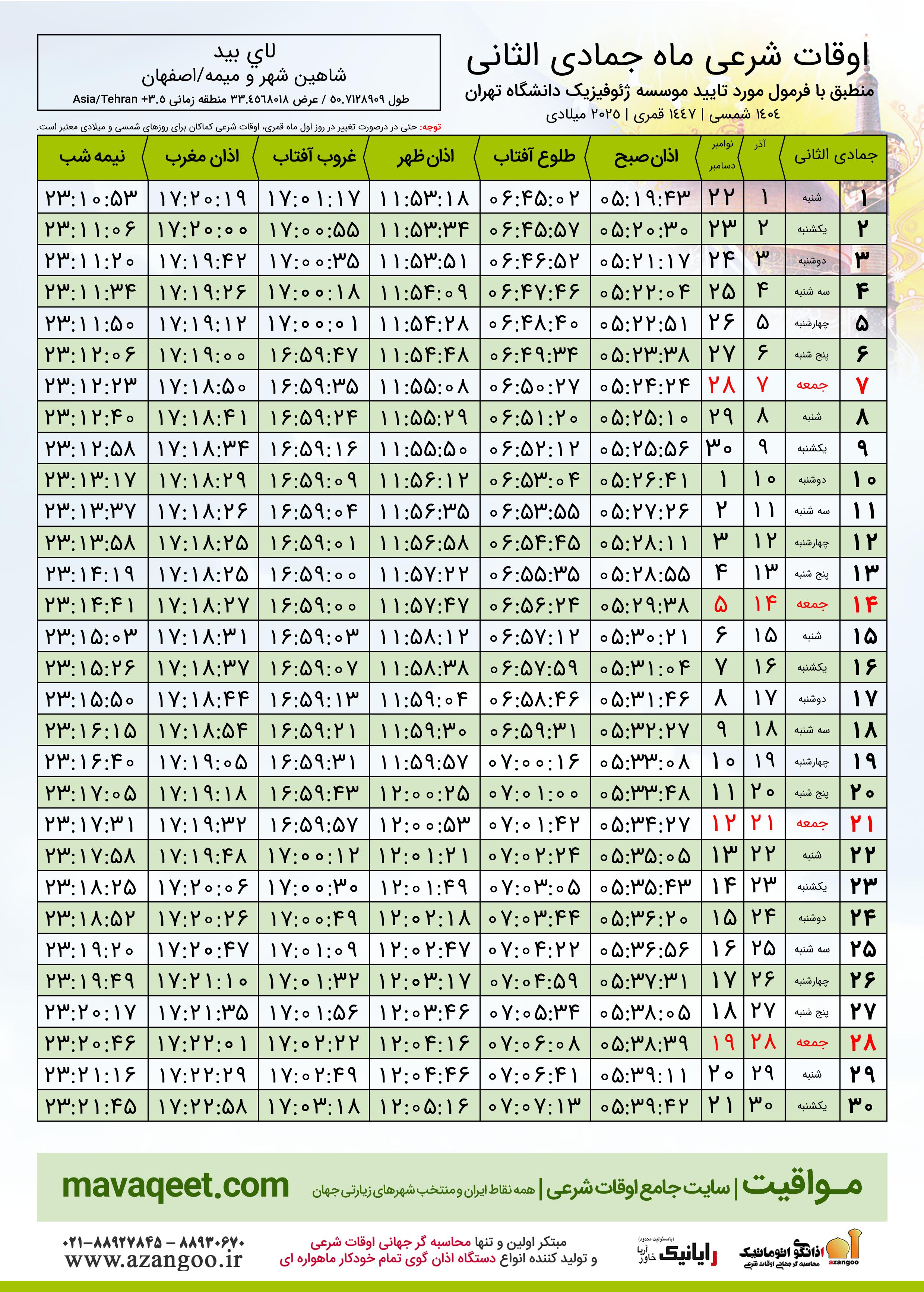 اوقات شرعی ماه جمادی الثانی ١٤٤٧ هـ.ق شهر لاي بيد بر
