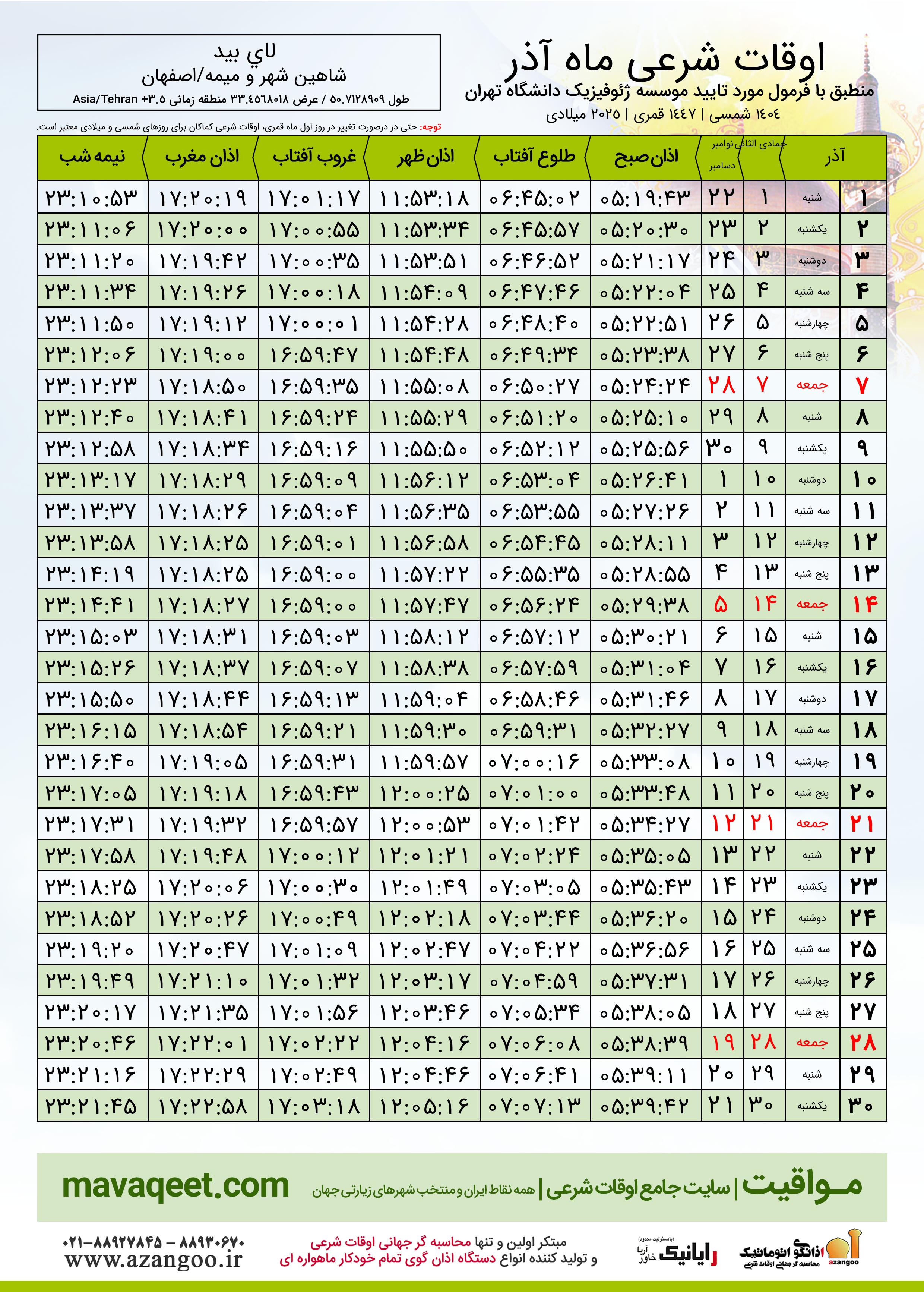 جدول اوقات شرعی آذر ١٤٠٤ شمسی شهر لاي بيد
